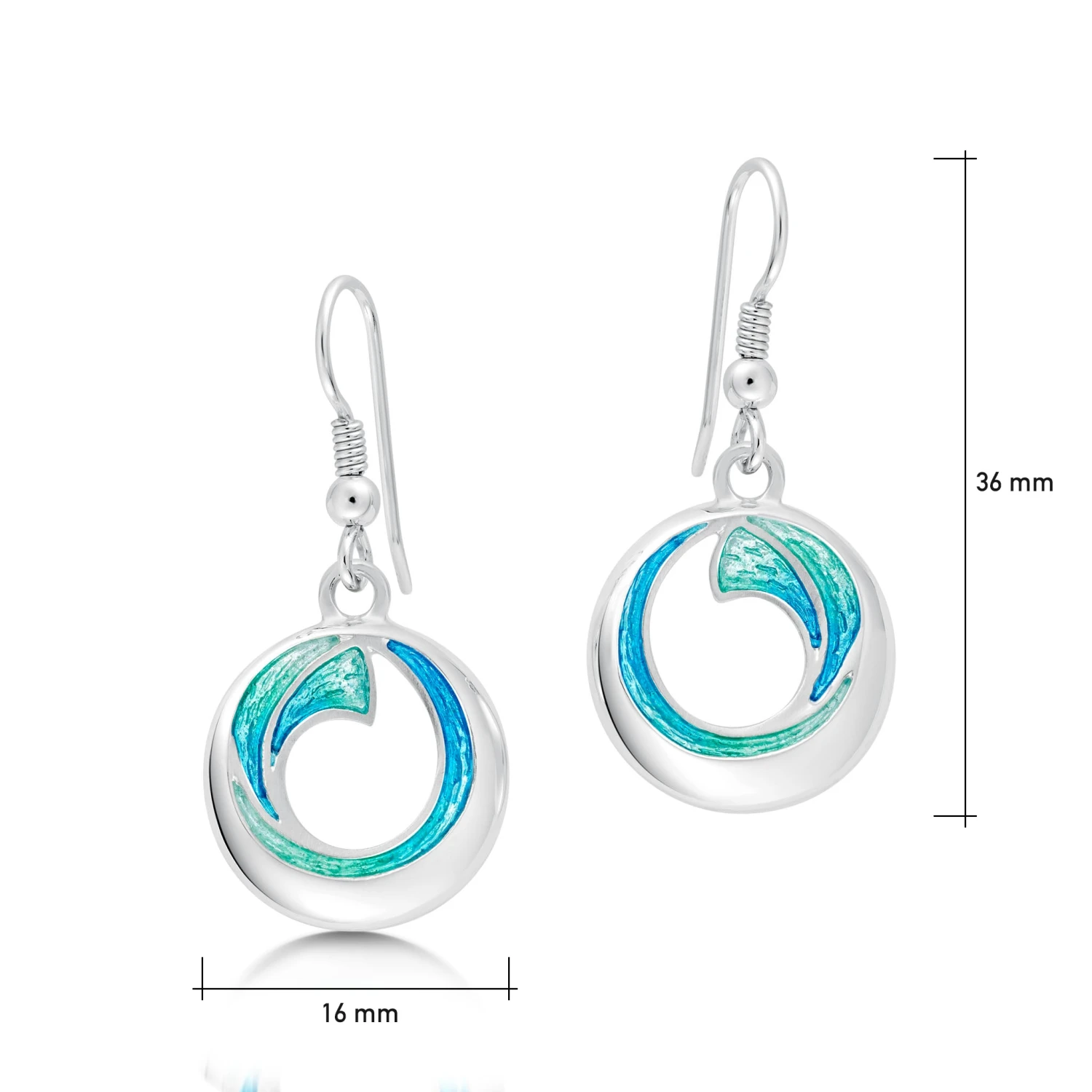 These Atlantic Breaker drop earrings in sterling silver feature a flowing wave design, beautifully highlighted in Shallows enamel. Each circular design has a diameter of approximately 17mm.