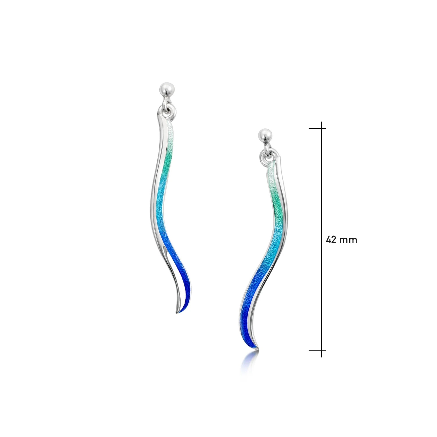 These Atlantic Swell earrings in sterling silver feature a delicate single frond elegantly hanging from each earring post, hand-enamelled in Ocean Hue enamel. Each earring has an overall drop length of approximately 42mm.