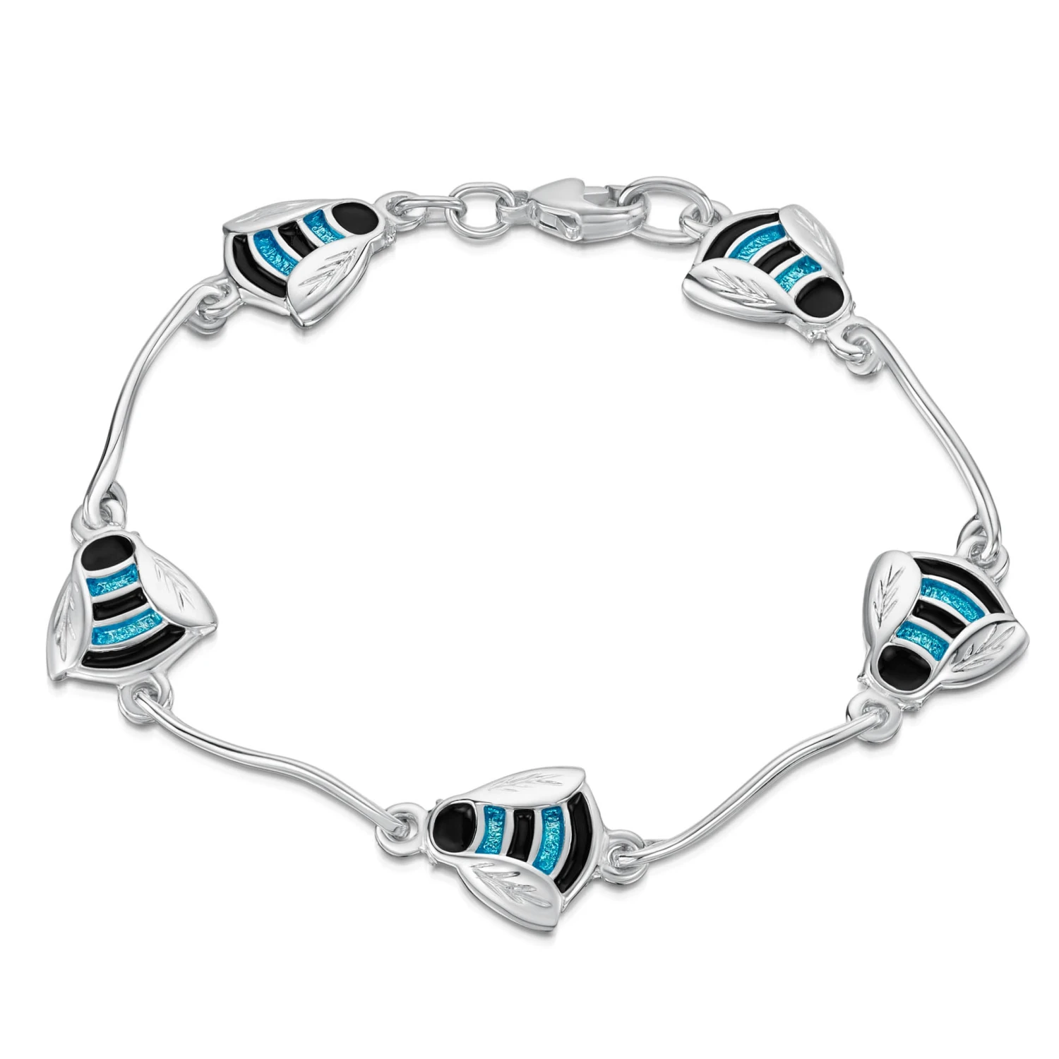 This Bumblebee bracelet in sterling silver features five cheerful bees in vivid blue and black enamels. Beautifully framed by polished silver wings, each bee measures approximately 18mm long and links to the next with a curved, solid silver bar. Hand-enamelled in our Orkney workshop.