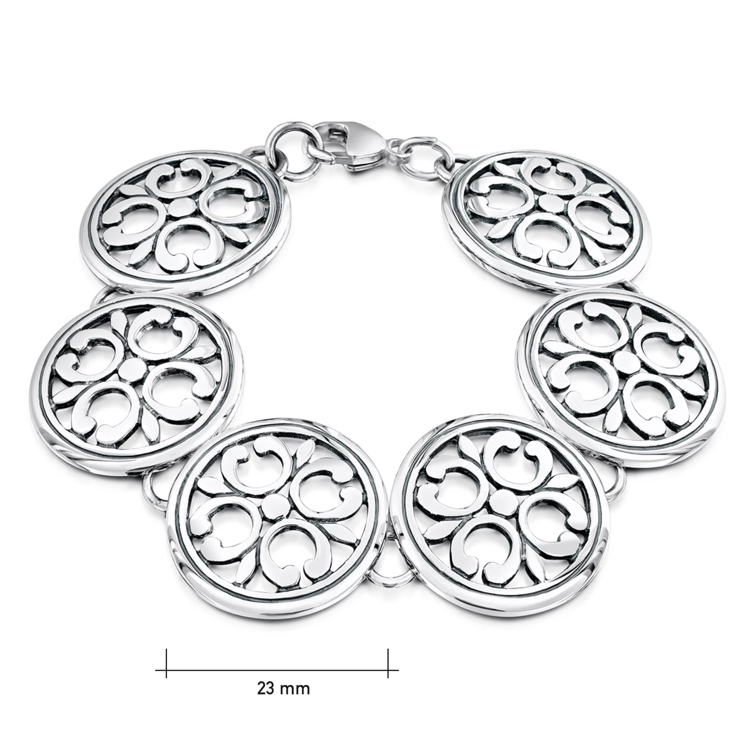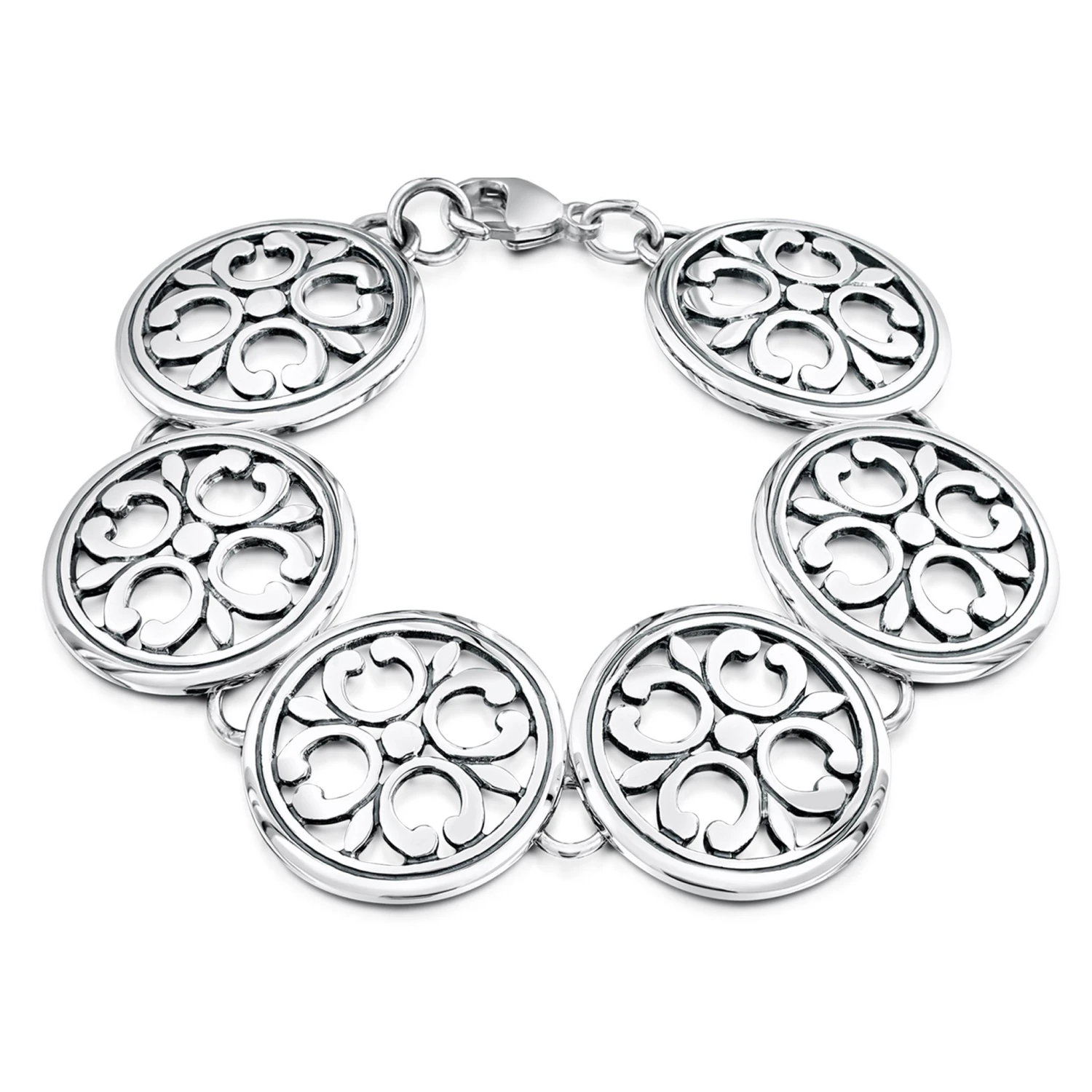 This Cathedral bracelet is one of three circular designs Sheila based on sandstone carvings in Orkney’s St Magnus Cathedral. The bracelet features six links, each approximately 23mm wide, joined with solid silver jump rings. The bold design of each link features four curved shapes separated with small teardrops, forming a subtle cross pattern. The surface of each link has a polished finish with the edges of the design highlighted in oxidised silver.