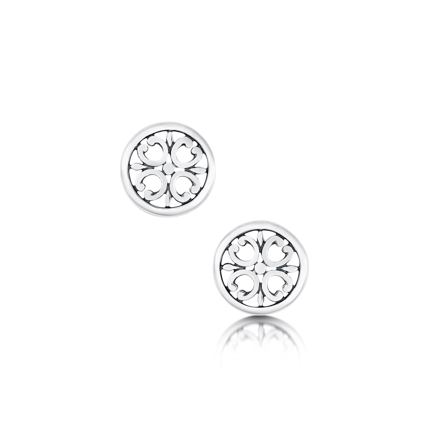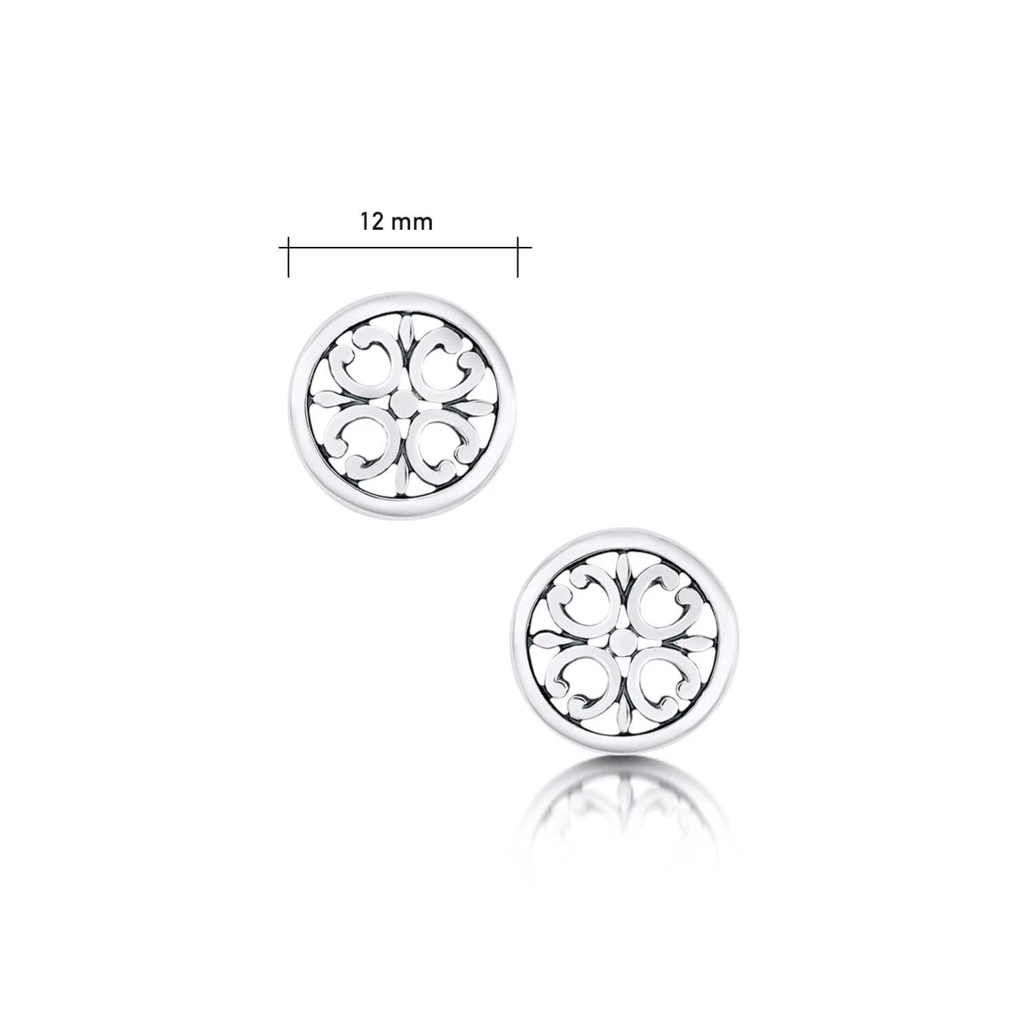 These small Cathedral stud earrings are based on one of three circular sandstone carvings in Orkney’s St Magnus Cathedral. This bold design features four curved shapes separated with small teardrops, forming a subtle cross pattern. The surface of the earrings has a polished silver finish with the edges of the design highlighted in oxidised silver. Each earring is approximately 12mm wide.
