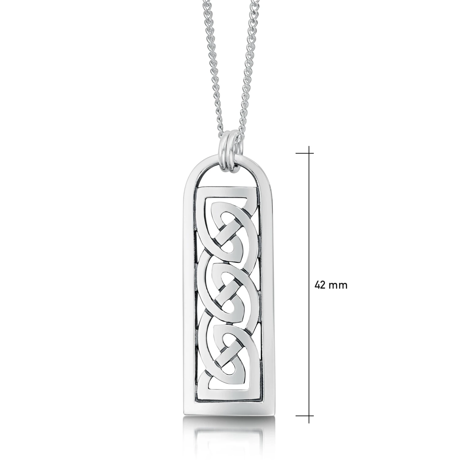 This Celtic pendant necklace in sterling silver features an intertwined knotwork design set within a silver frame reminiscent of an arched window. The pendant’s knotwork design is highlighted in oxidised silver and is hand-finished in our Orkney workshop.