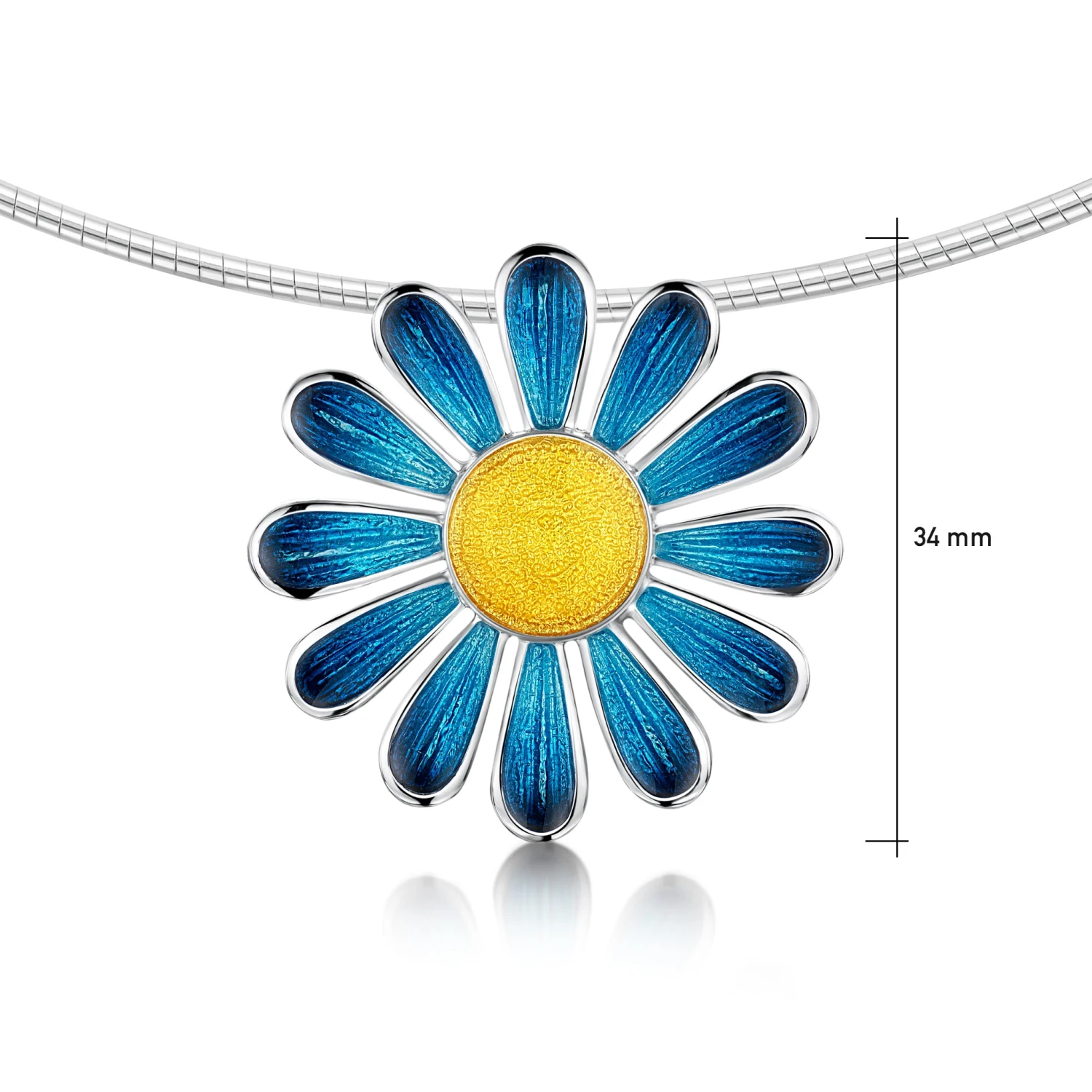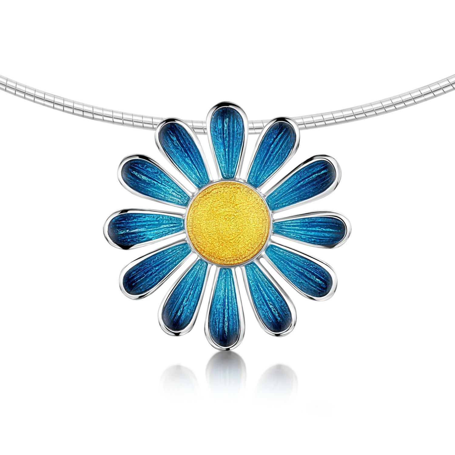 This Coloured Daisies dress necklace in sterling silver features a colourful daisy on a silver neckwire, hand-enamelled in ‘Tropical’. The piece measures approximately 34mm wide and is hand-finished in our Orkney workshop.