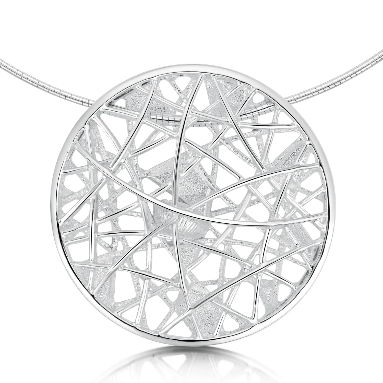This enamelled sterling silver Creel Necklace mimics the pattern of fishermen’s creels. Silver strands on the front of the piece combine and curve to form elegant shapes, the ‘Pentland’ enamel representing trapped sea water. The piece hangs on a silver neckwire.