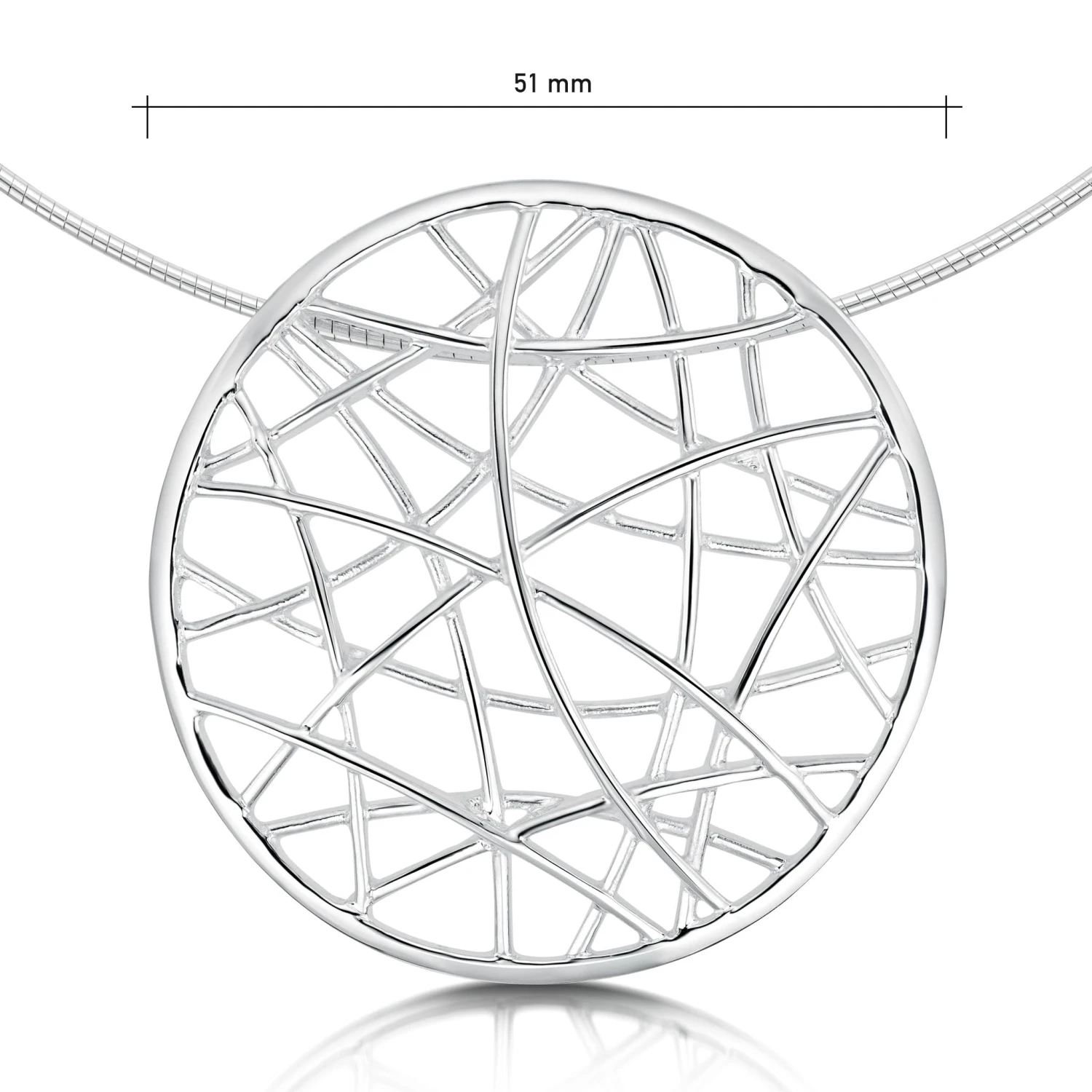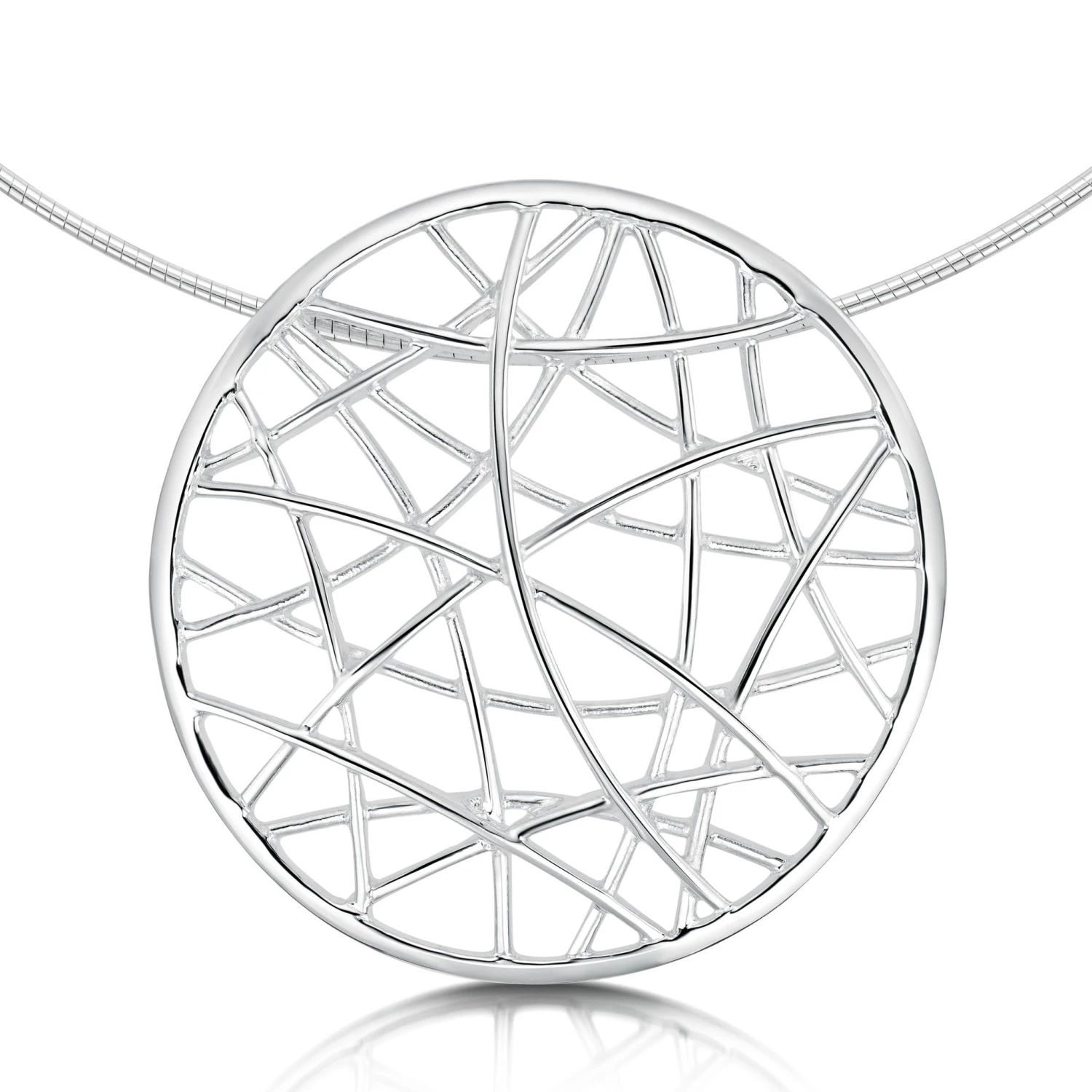 This sterling silver Creel Necklace mimics the pattern of fishermen’s creels. Silver strands on the front of the piece combine and curve to form elegant shapes. The piece hangs from a silver neckwire and measures approximately 51mm in diameter.