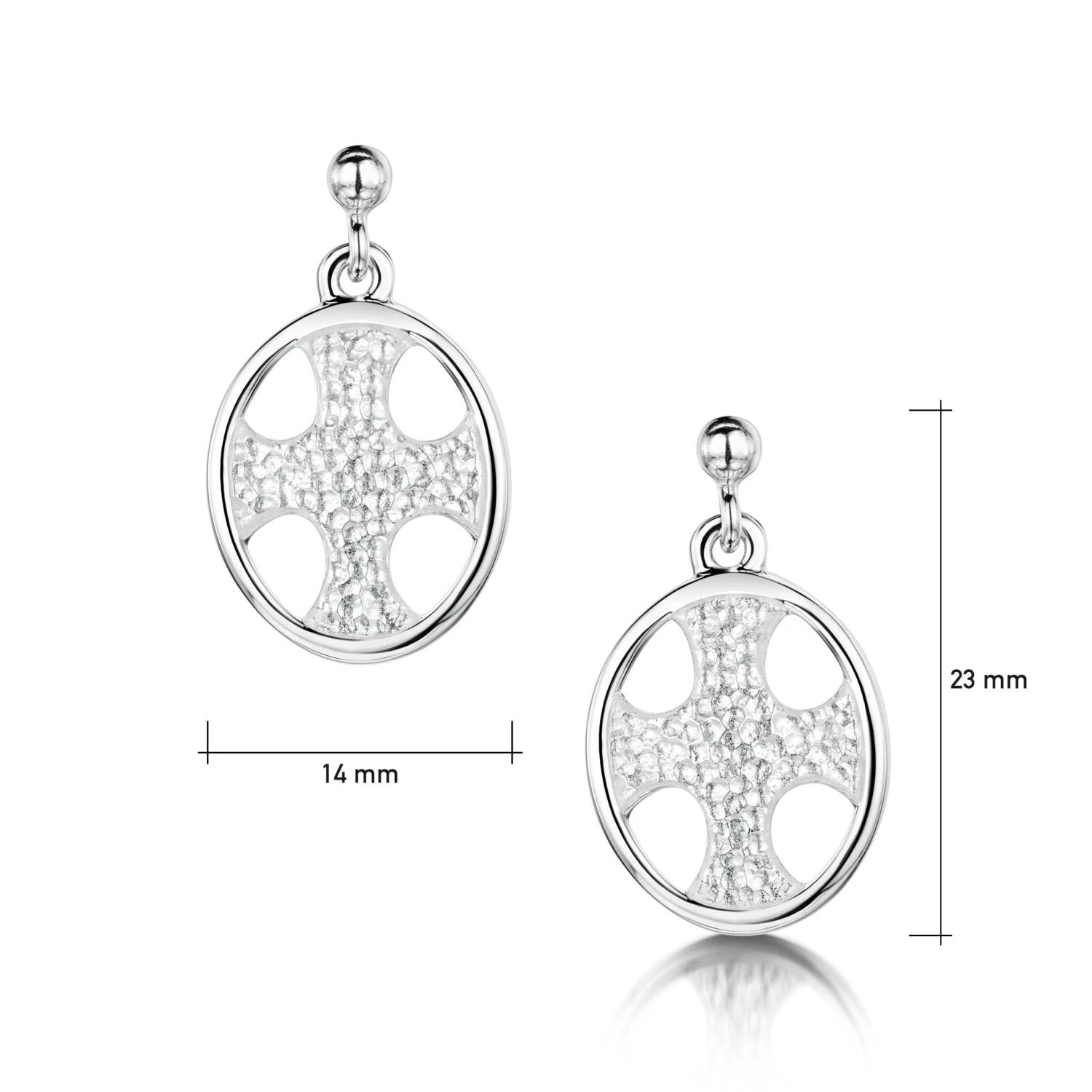 These Cross of the Kirk drop earrings in sterling silver are hand-enamelled in our Orkney workshop in ‘Crystal’ enamel. Each cross design is approximately 14mm x 17mm and hangs from a silver post.