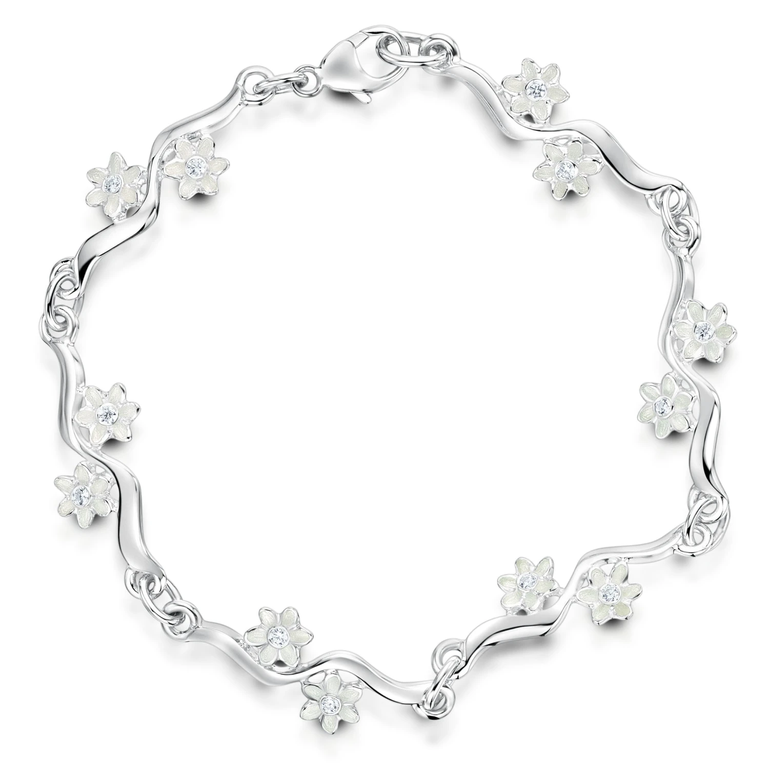 This sterling silver Daisies at Dawn bracelet features twelve small daisies, arranged in pairs on solid silver links and hand-enamelled in our Orkney workshop. Each daisy is hand-set with a 1.8mm cubic zirconia.