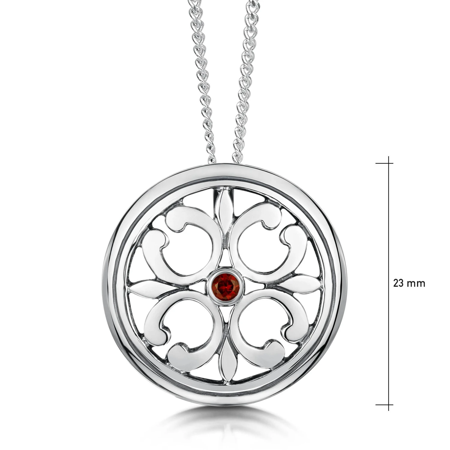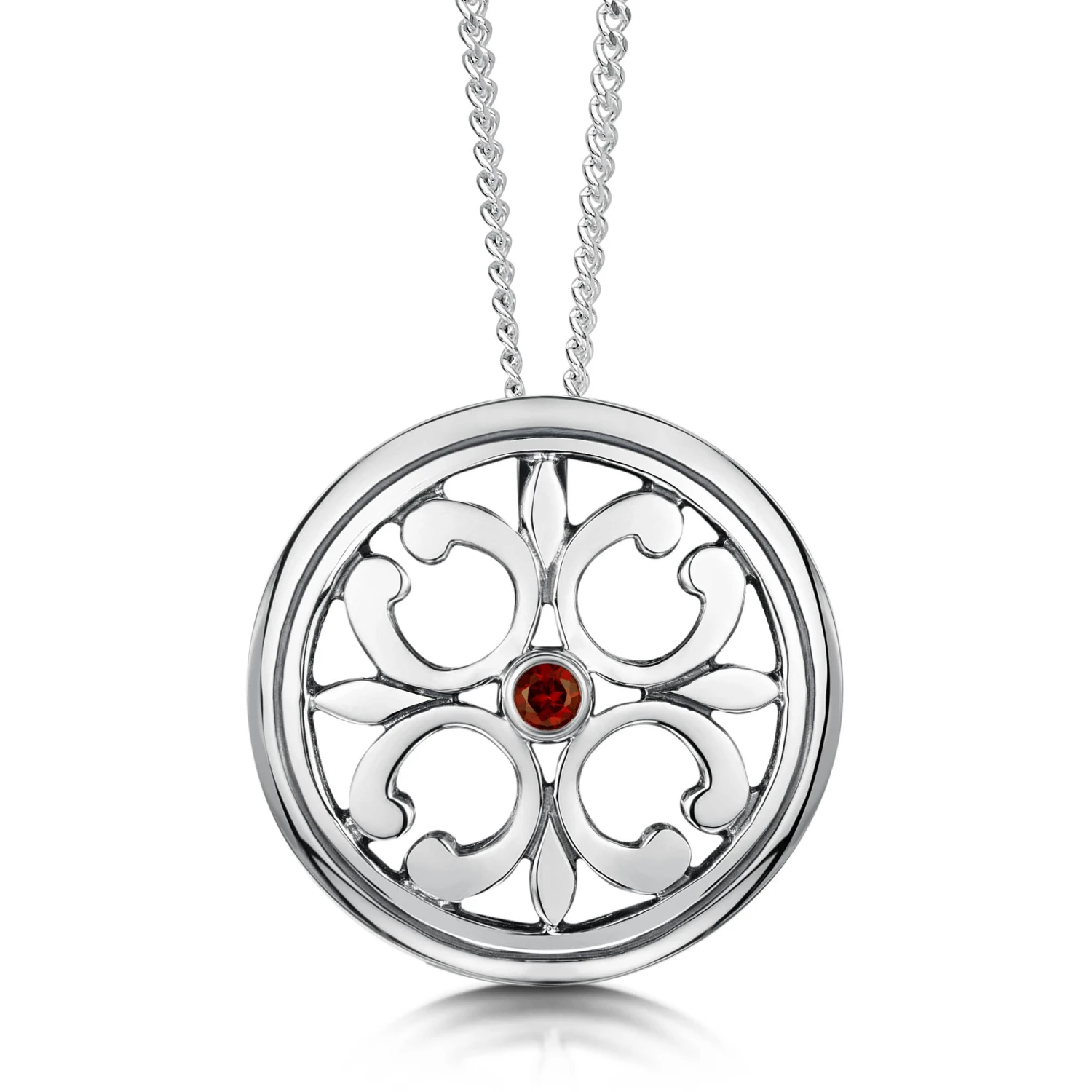 This Cathedral pendant necklace in sterling silver is hand-set with a 3mm garnet. The design measures approximately 23mm and hangs from a silver neckwire.