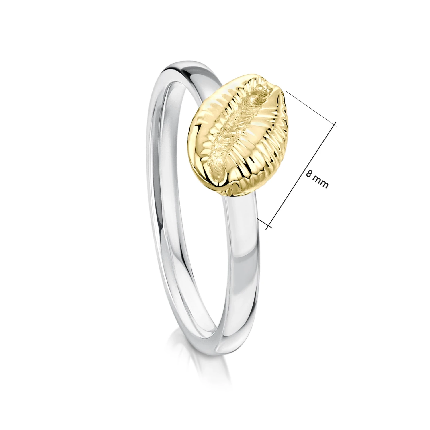 This Groatie Buckie ring features a small northern cowrie shell in solid 9ct yellow gold, delicately placed on a 2mm silver band and hand-finished in our Orkney workshop.