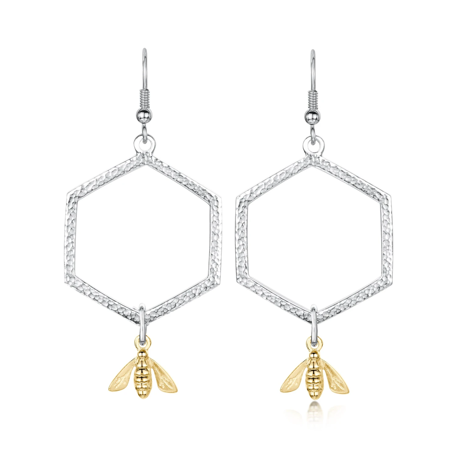 These sterling silver Honeycomb earrings feature a textured hexagon hanging from silver hooks. Each hexagon measures approximately 30mm wide and is complemented with a 9ct yellow gold honeybee. The earrings have an overall drop length of 66mm.