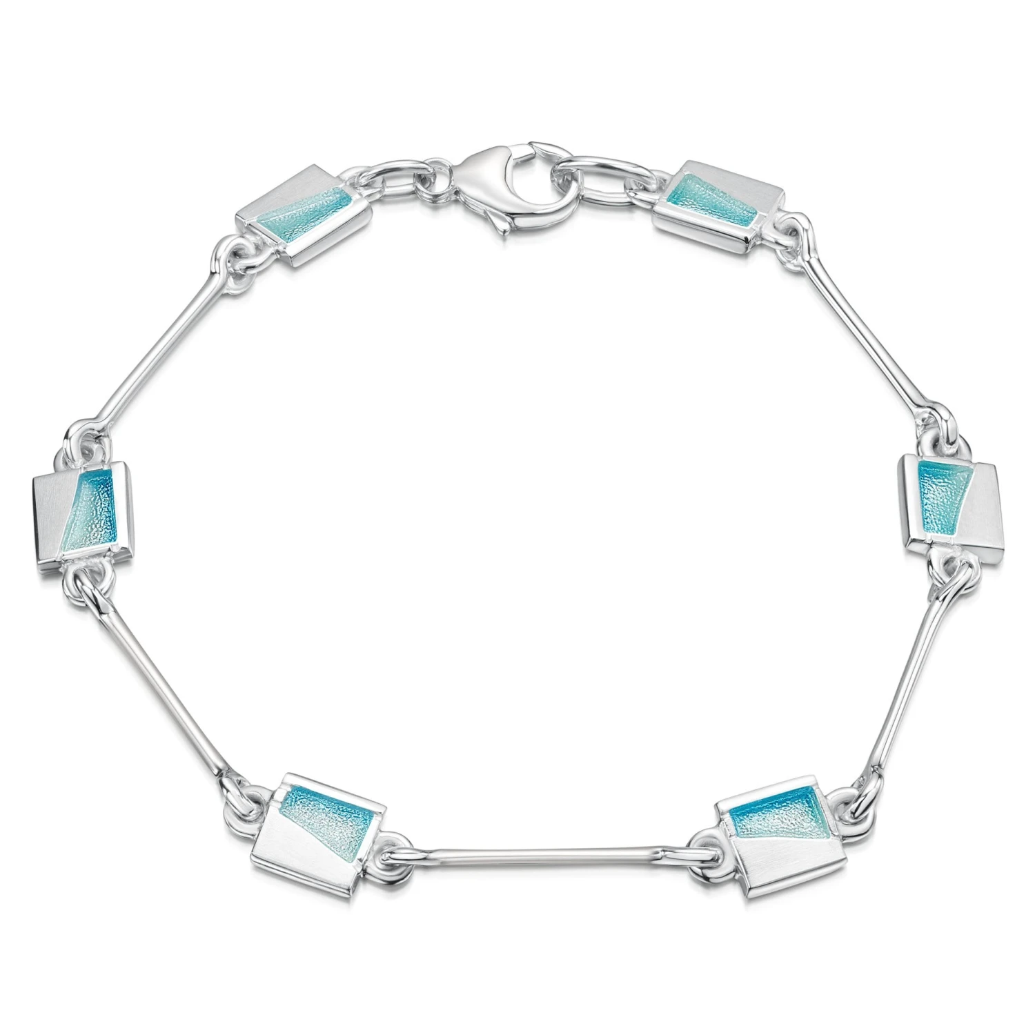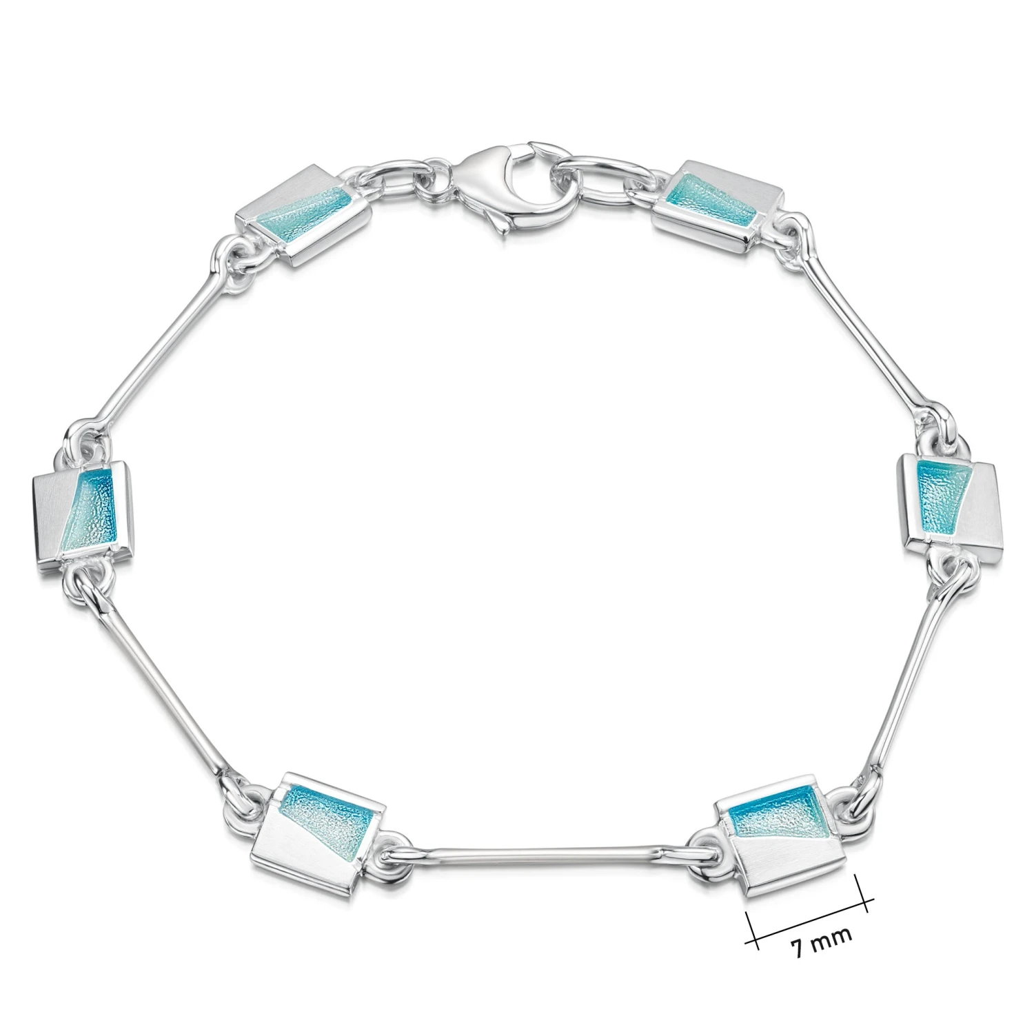 This Island Panorama bracelet features six enamelled sterling silver links, each approximately 12mm by 12mm, and connected using solid silver bars. Each link is hand-enamelled in ‘Shallows’ in our Orkney workshop.