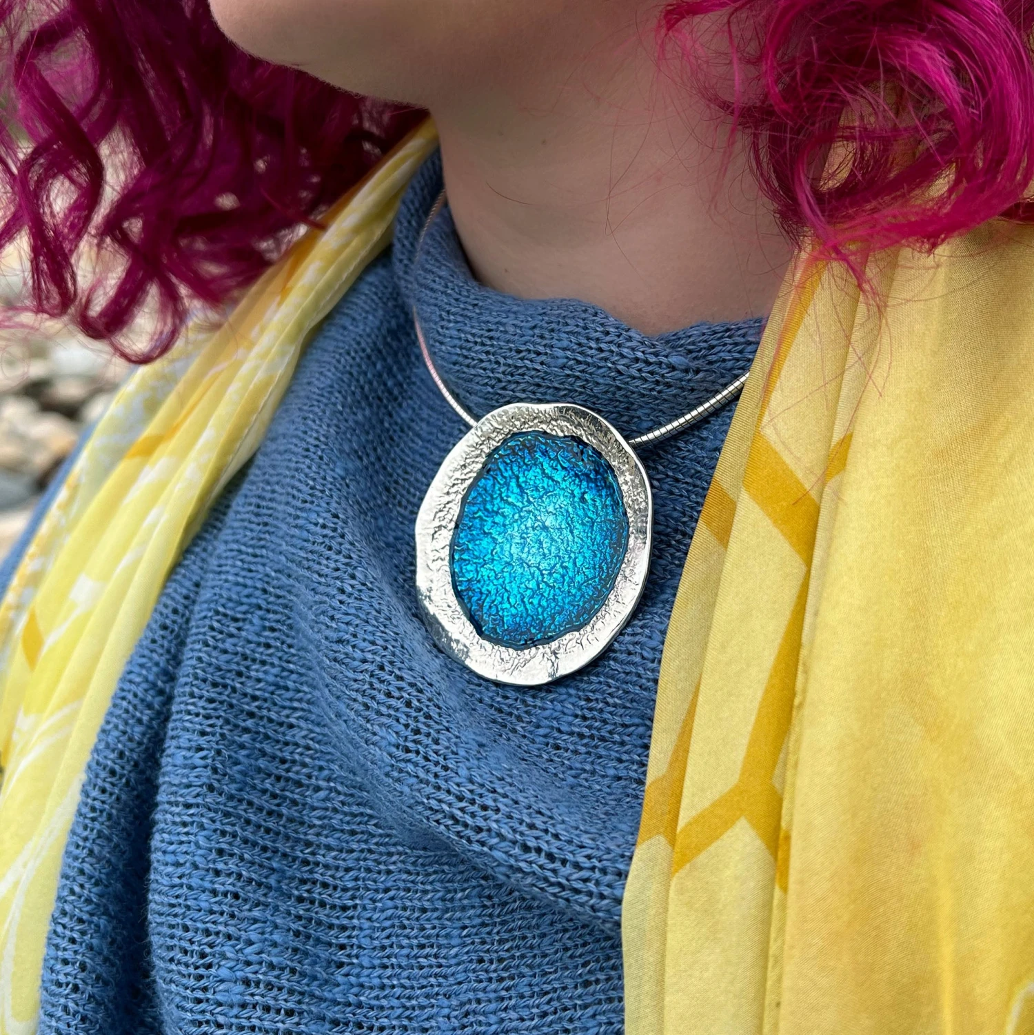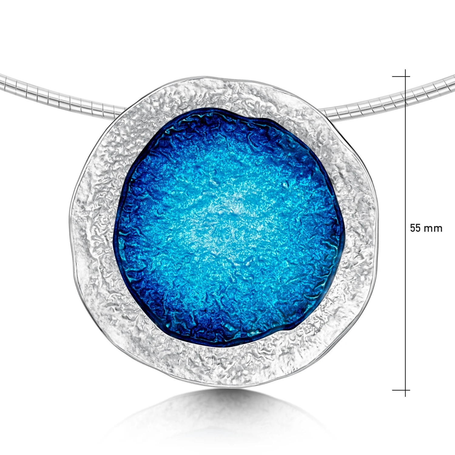 This Lunar necklace is a true statement piece. The stunning textured cup-mark design is hand-enamelled in Tropical enamel in our Orkney workshop and hangs elegantly from a silver wire. The design measures approximately 55mm in diameter.