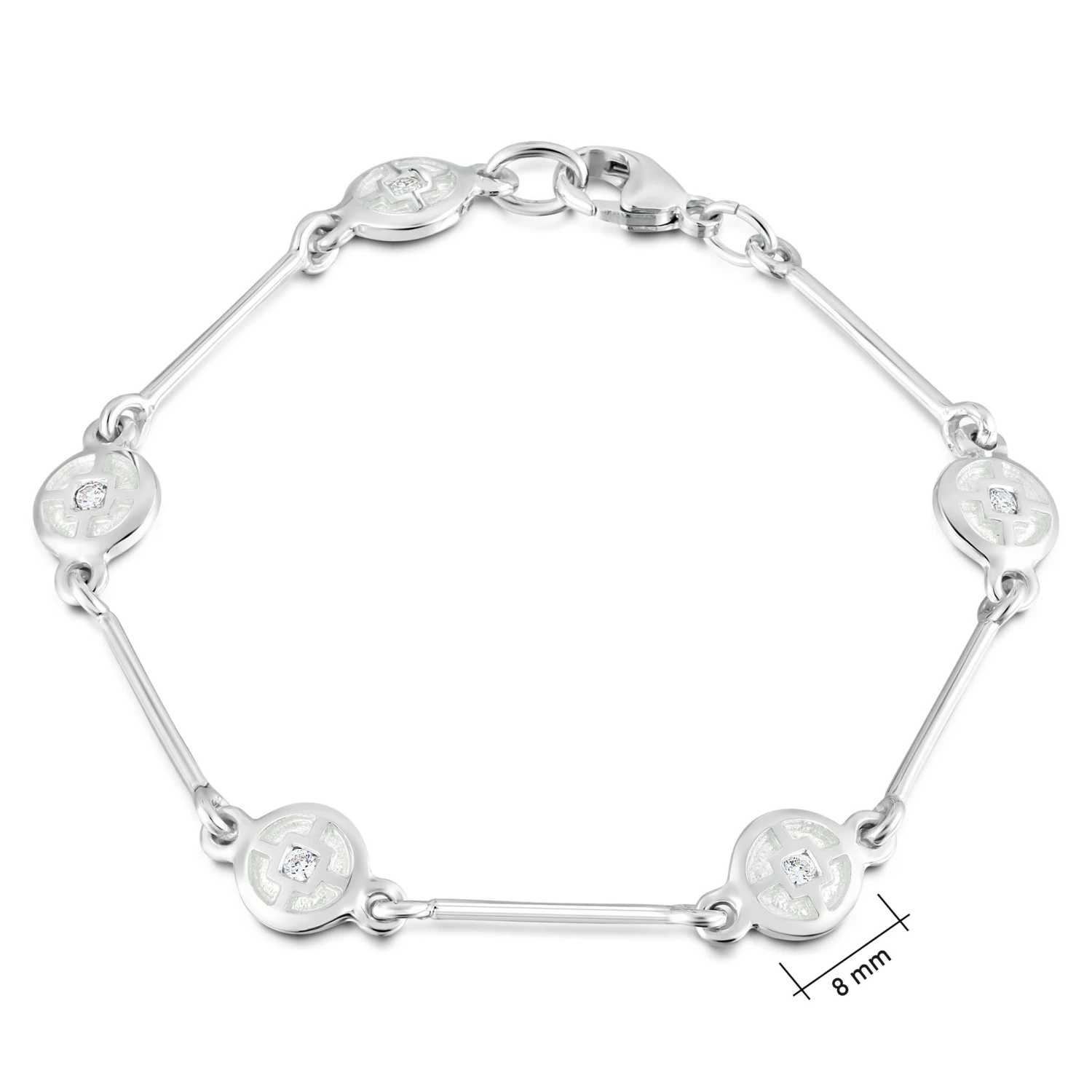 This Mine Howe bracelet in sterling silver features five links, each joined to the next with a solid silver bar, and hand-enamelled in our workshop in Orkney. The centre of each design is enhanced with a 2mm cubic zirconia.