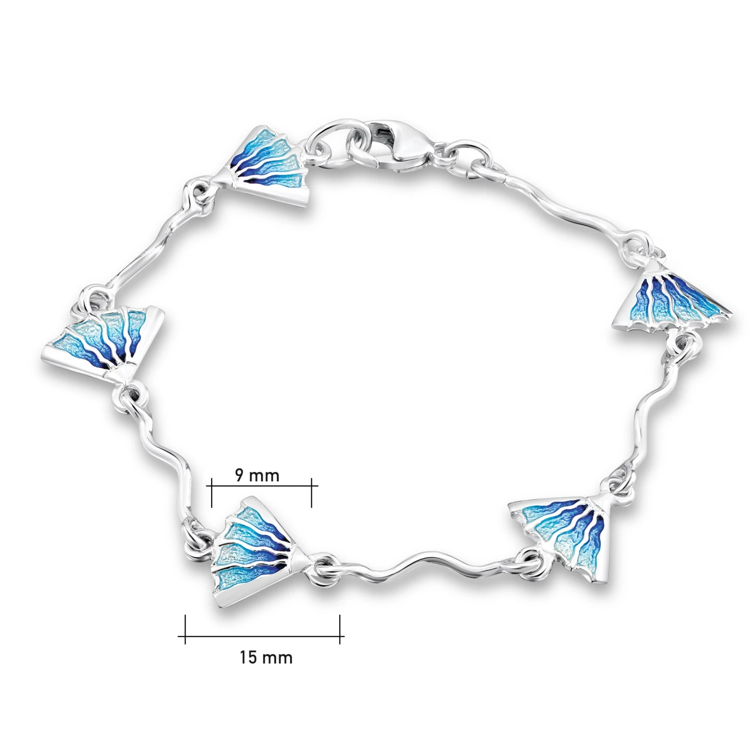 This Ocean bracelet in sterling silver consists of five seaweed forms linked together with curved, flowing silver bars. The seaweed designs are hand-enamelled in our Orkney workshop in a colourway reminiscent of the deep oceans around Orkney.