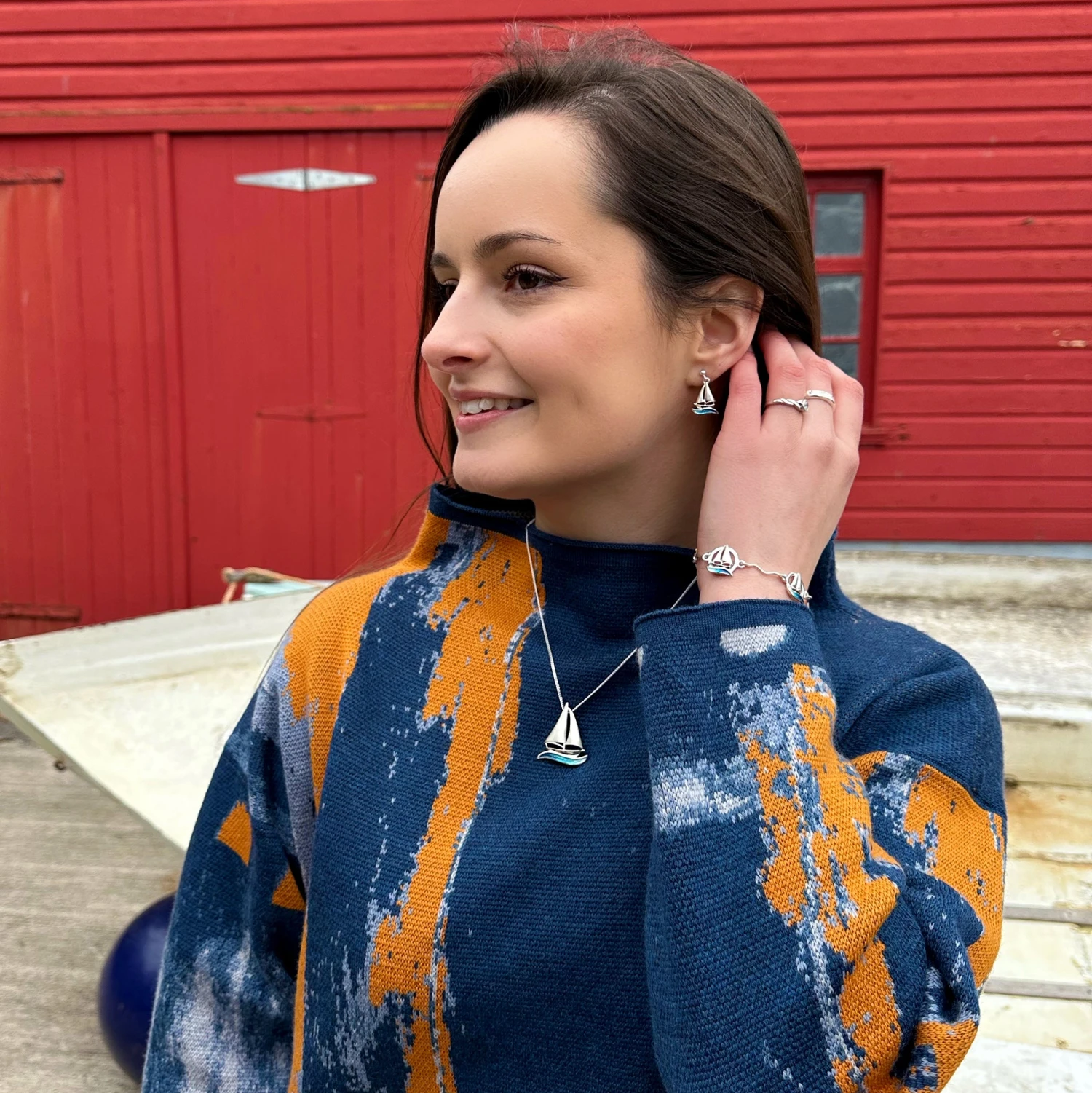 This Orkney Yole pendant in sterling silver features a traditional sailing boat on the crest of a wave. The curved wave is hand-enamelled in our Orkney workshop in ‘Tempest’ enamel, and the piece hangs elegantly on a silver curb chain.