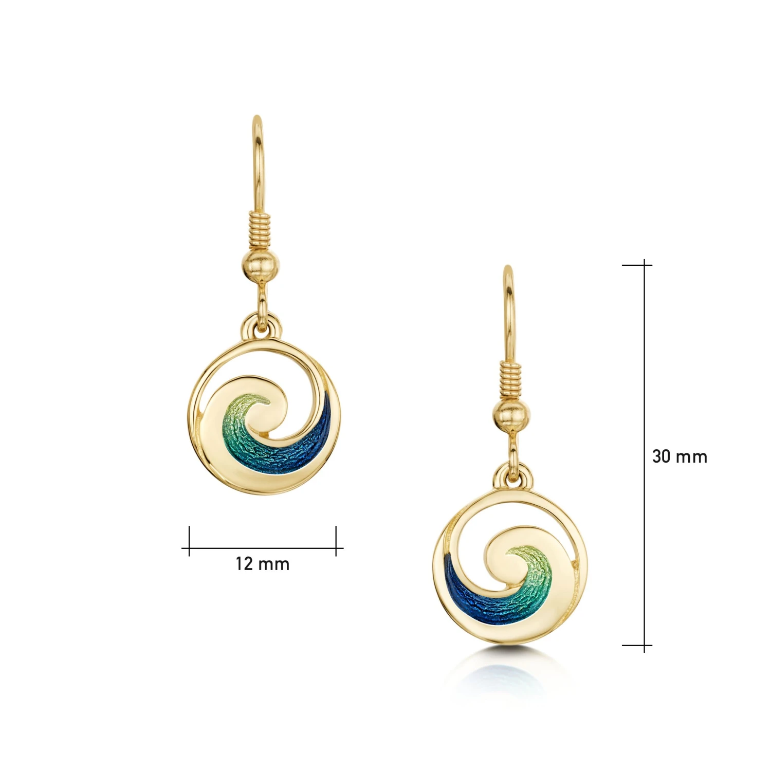 These Pentland drop earrings in luxurious 18ct yellow gold feature a continuous wave design delicately hanging from gold hooks. They are hand-enamelled in the colour ‘Ocean’ in our workshop in Orkney.