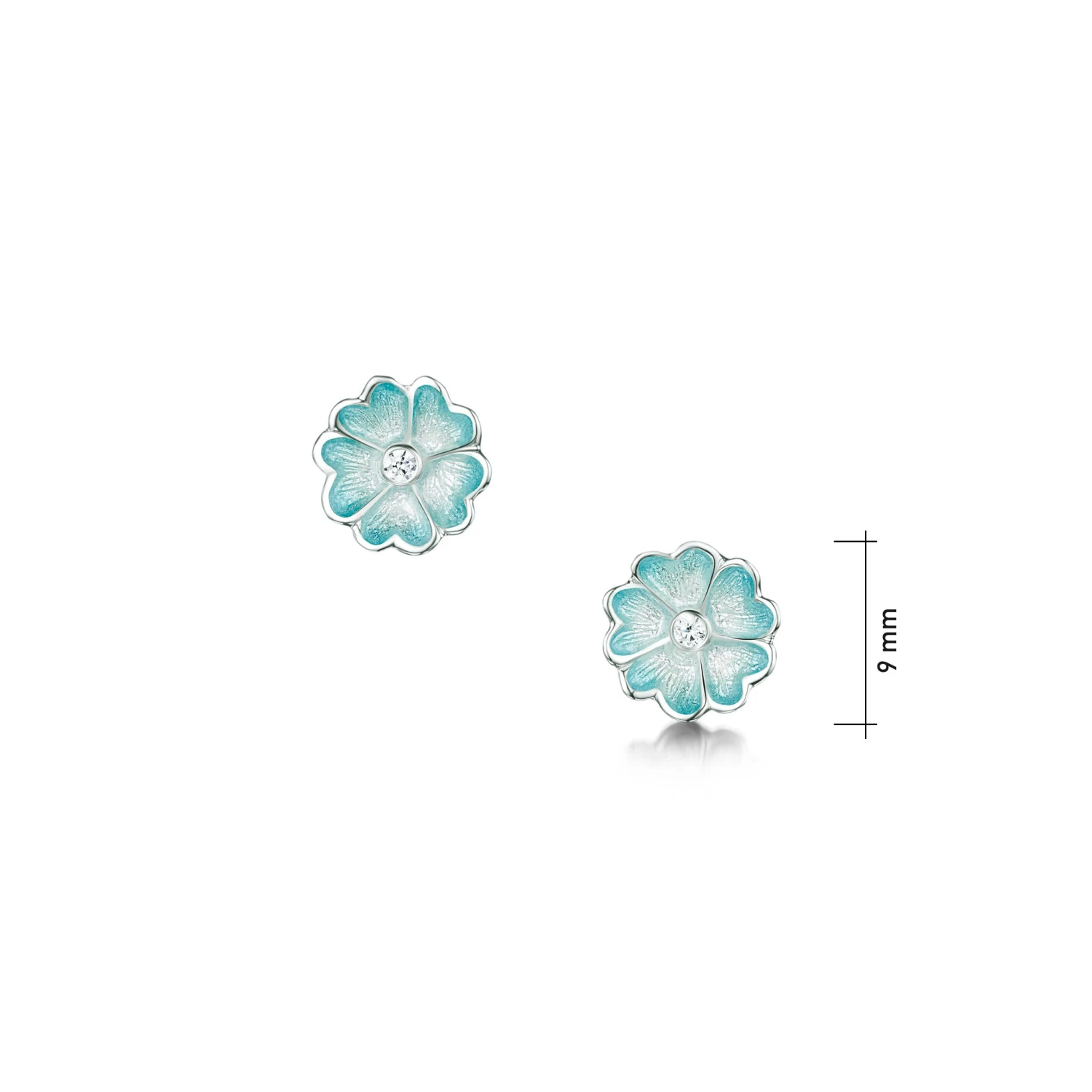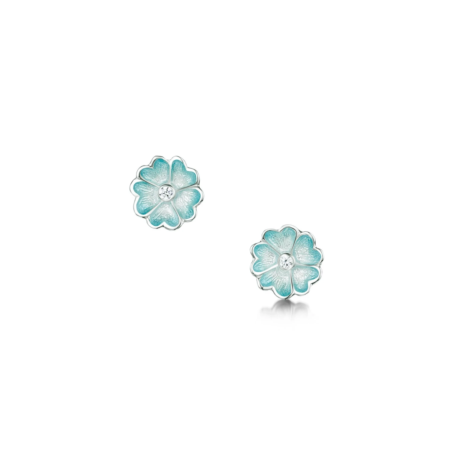 These sterling silver Primula Scotica stud earrings feature a single primula flower, hand-set with a cubic zirconia in its centre. Each flower is hand-enamelled in ‘Surf’ enamel in our Orkney workshop and measures approximately 9mm in diameter.
