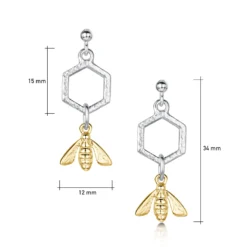 Honeycomb & Bee Petite Drop Earrings In Silver & 9ct Yellow Gold
