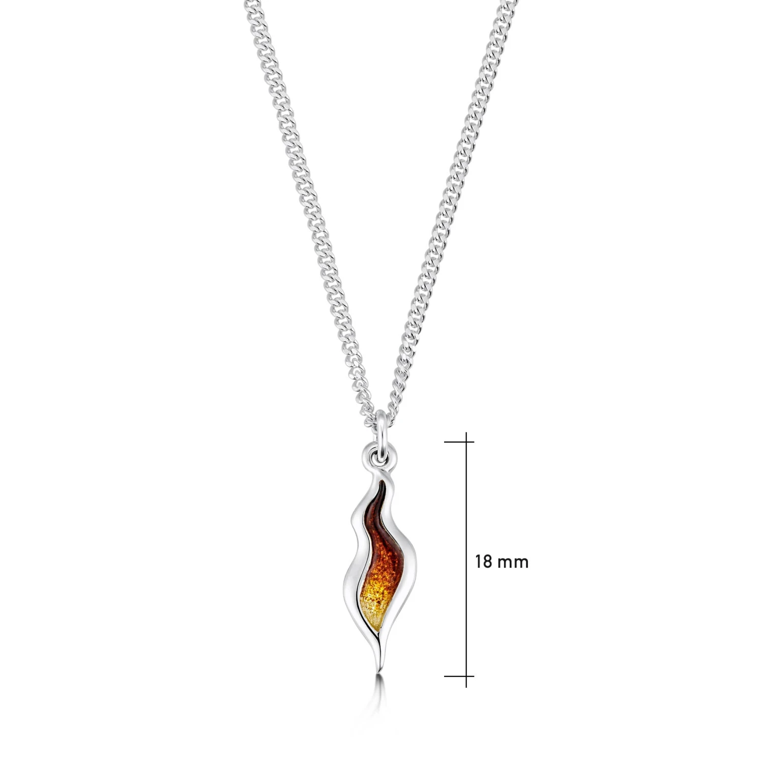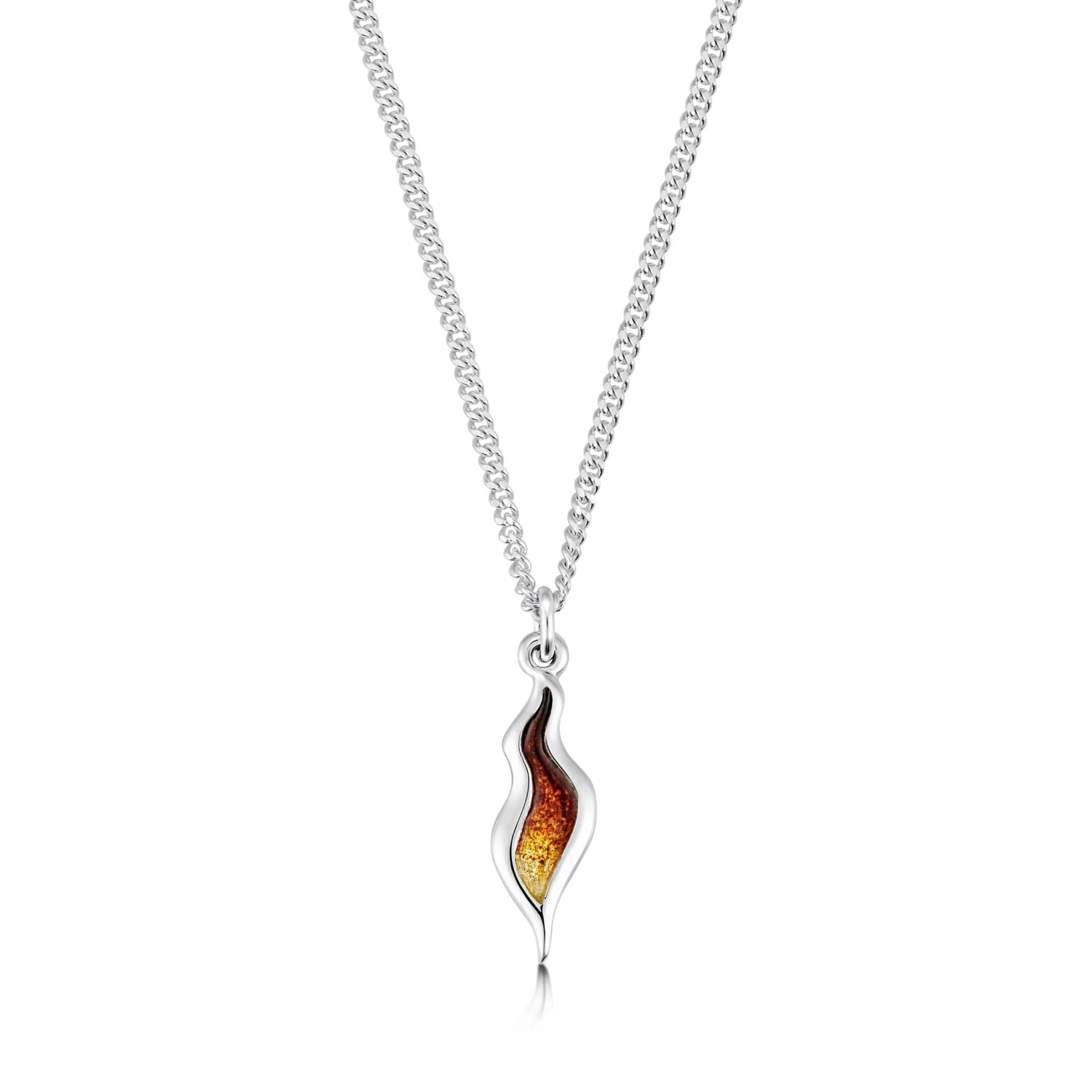 This small River Ripples pendant in sterling silver features a delicate ripple design, hand-enamelled in our Orkney workshop in Flame enamel. The design drops from a silver curb chain and measures approximately 18mm high.