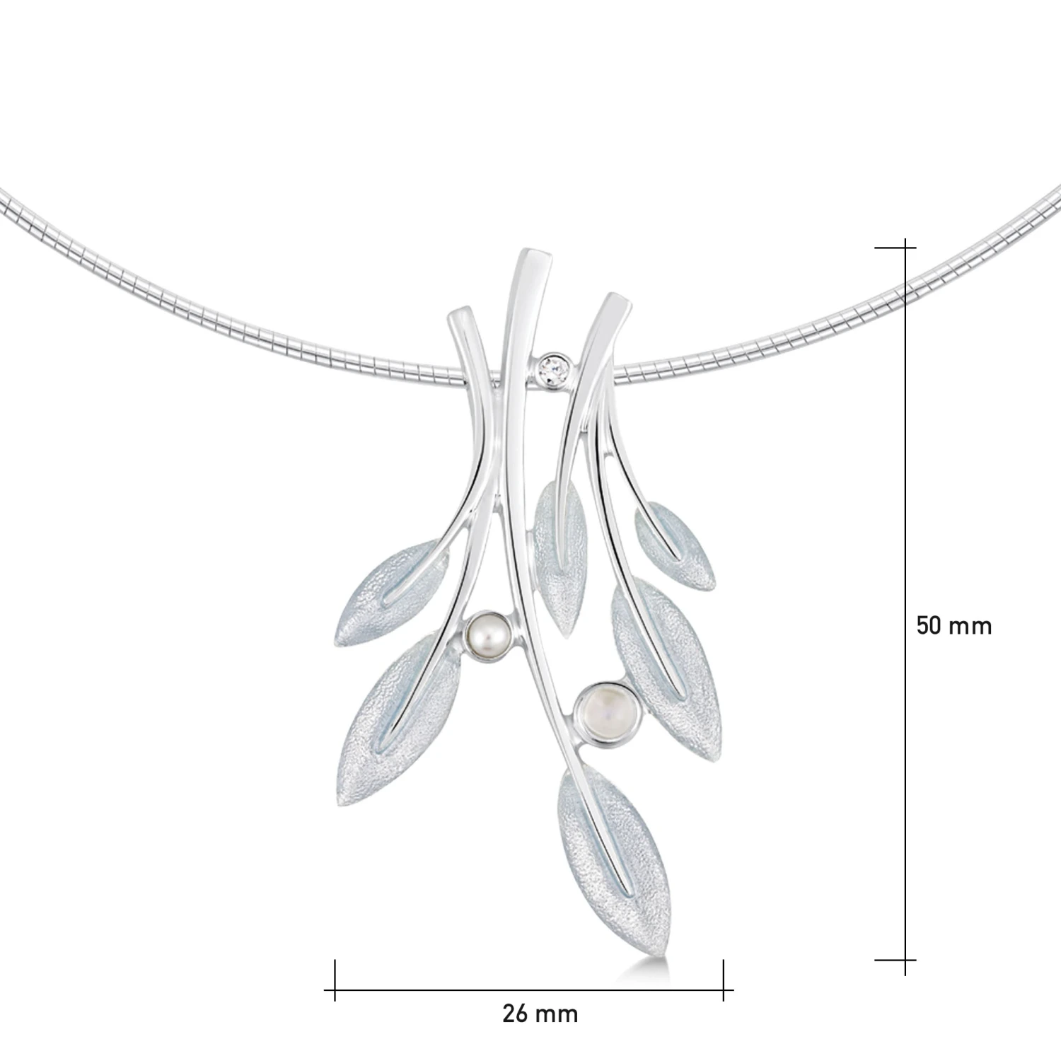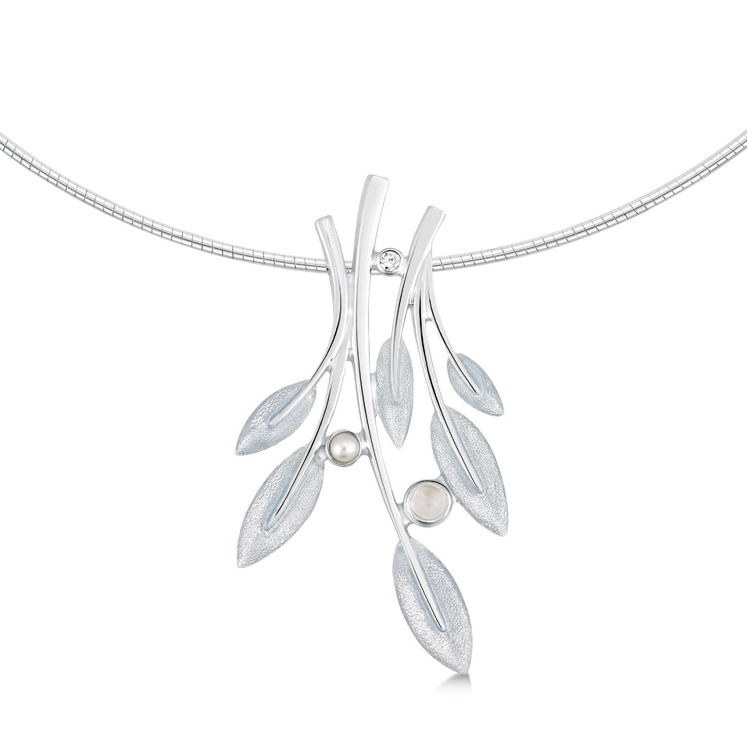 This sterling silver Rowan Dress Necklace features six intricate leaves in Frost enamel on flowing silver branches. The piece is beautifully laced with a moonstone, pearl and cubic zirconia, each set by hand in our Orkney Workshop.