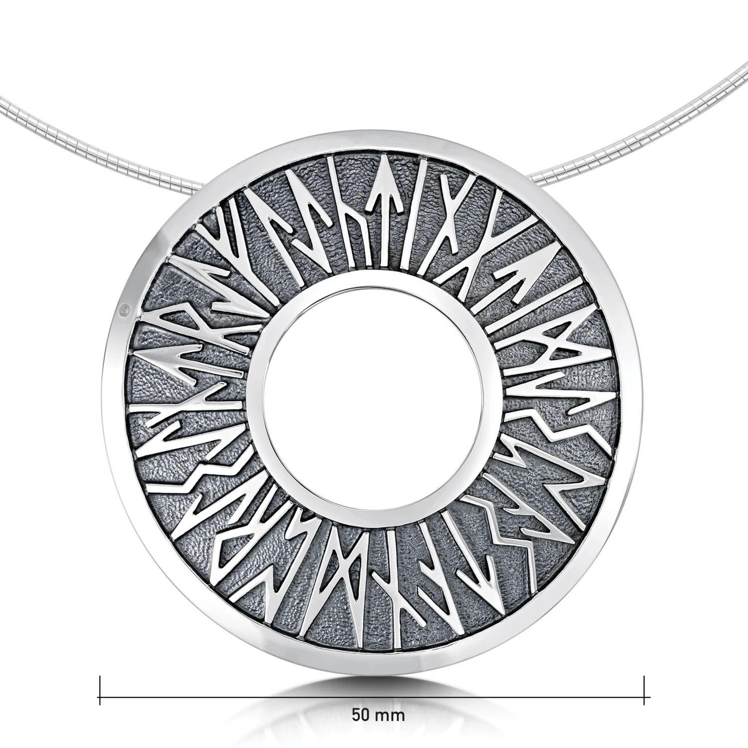 This is one of Sheila Fleet’s most iconic and classic designs, commonly known as her Runic Iris. The dress necklace features runic text in polished silver, set within an oxidised silver background, and reads ‘Reflecting times past and present’. The circular design is approximately 50mm in diameter and hangs elegantly from a silver wire.