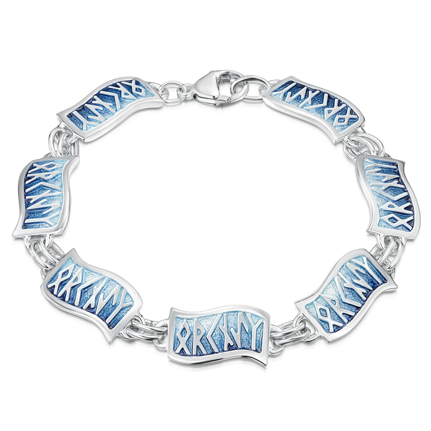 This Runic bracelet in sterling silver features seven enamelled links with silver runic text. Each runic inscription reads ‘Orkney’ and is hand-enamelled in ‘Skaill’ enamel in our Orkney workshop.