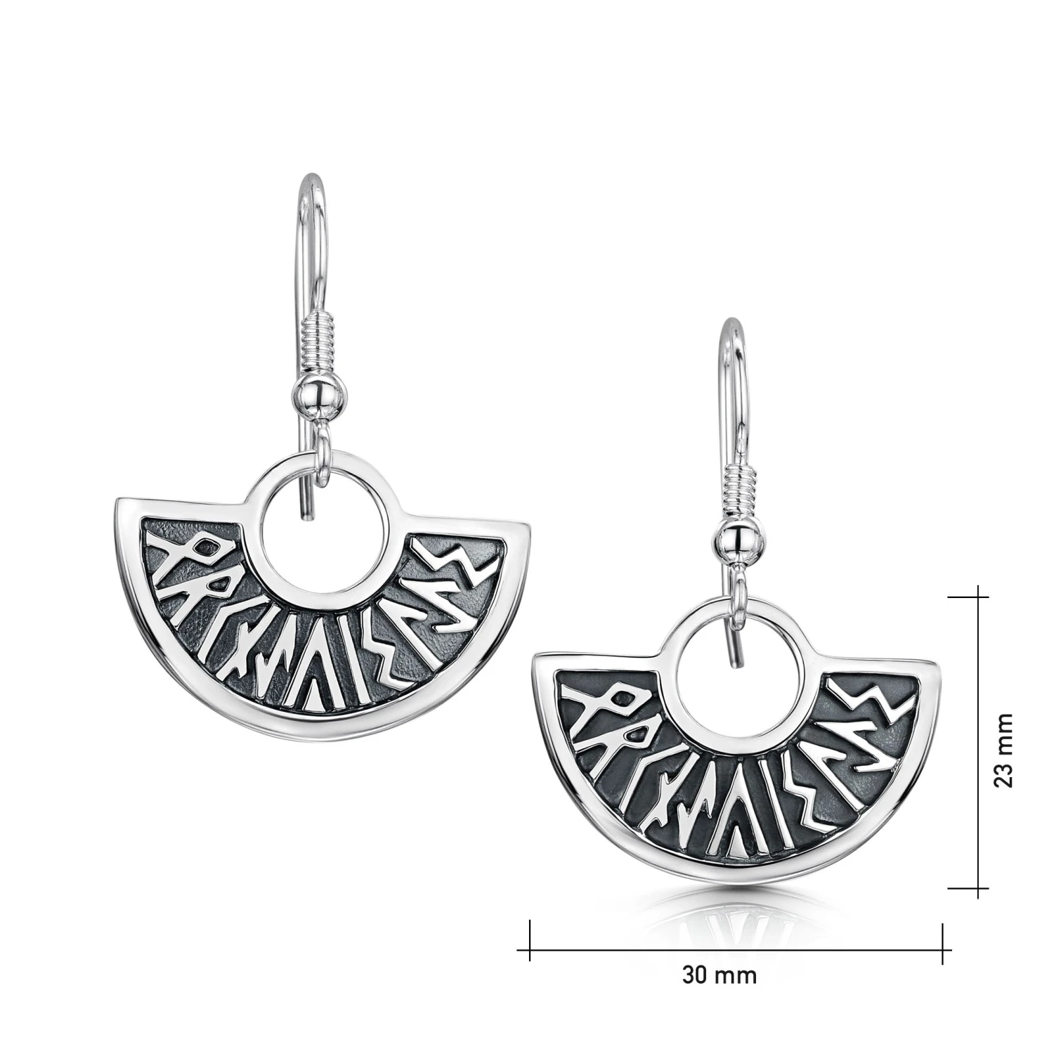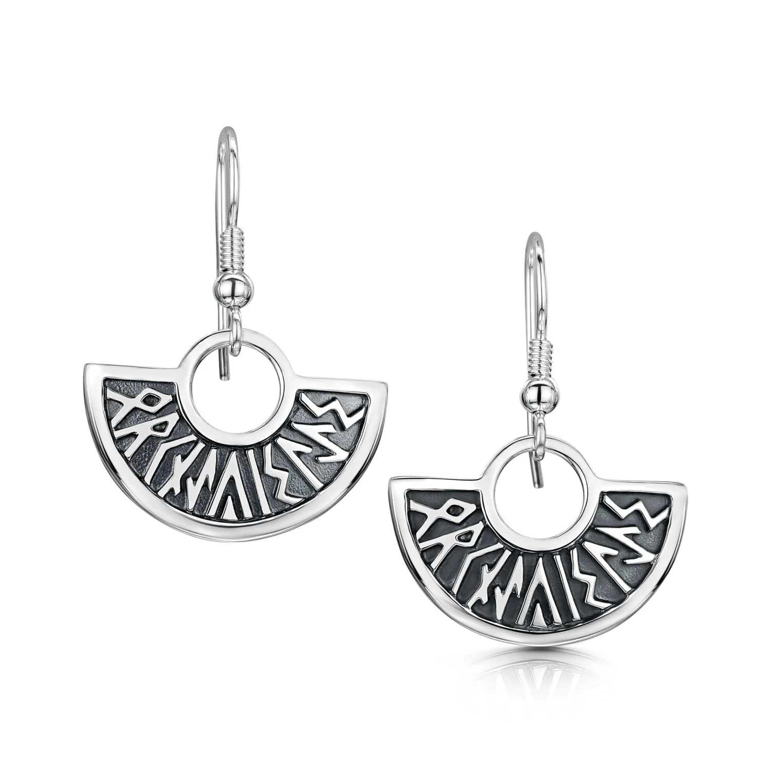 These Runic drop earrings in oxidised sterling silver feature runic text that reads ‘Orkney Isles’ adorning the semi-circular design. The earrings hang delicately from silver hooks and are hand-finished in our Orkney workshop.