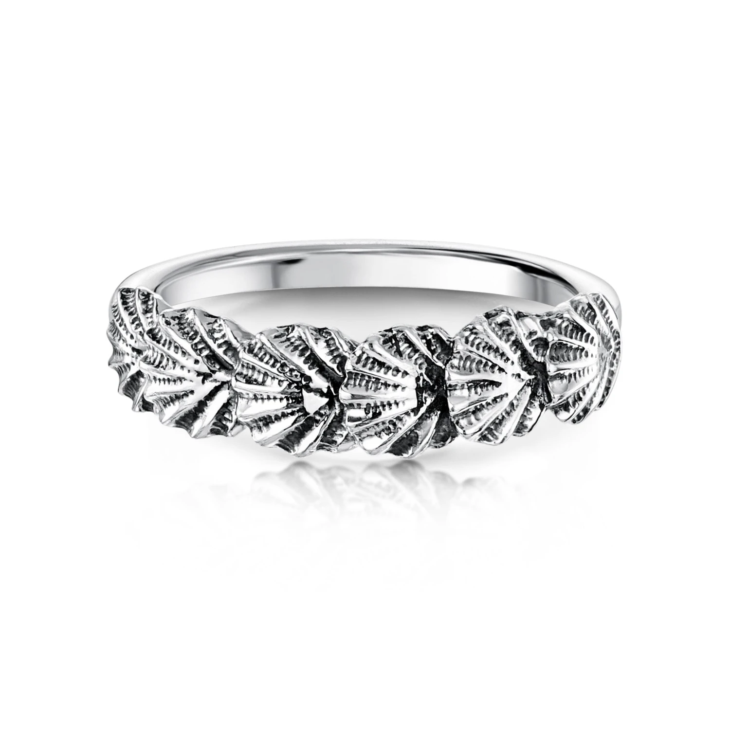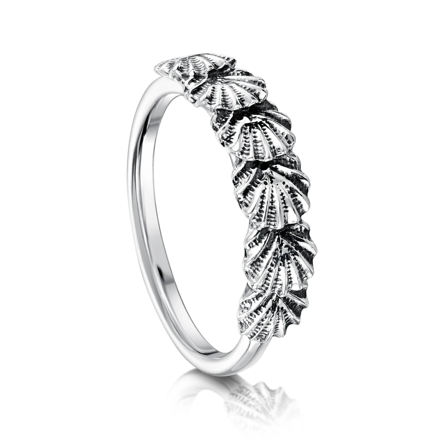 This Scallop ring in sterling silver features six tiny, overlapping scallop shells, beautifully highlighted in oxidised silver. The shells elegantly overlap each other and sit on a 2mm wide silver band. The ring measures 6mm at its widest point.