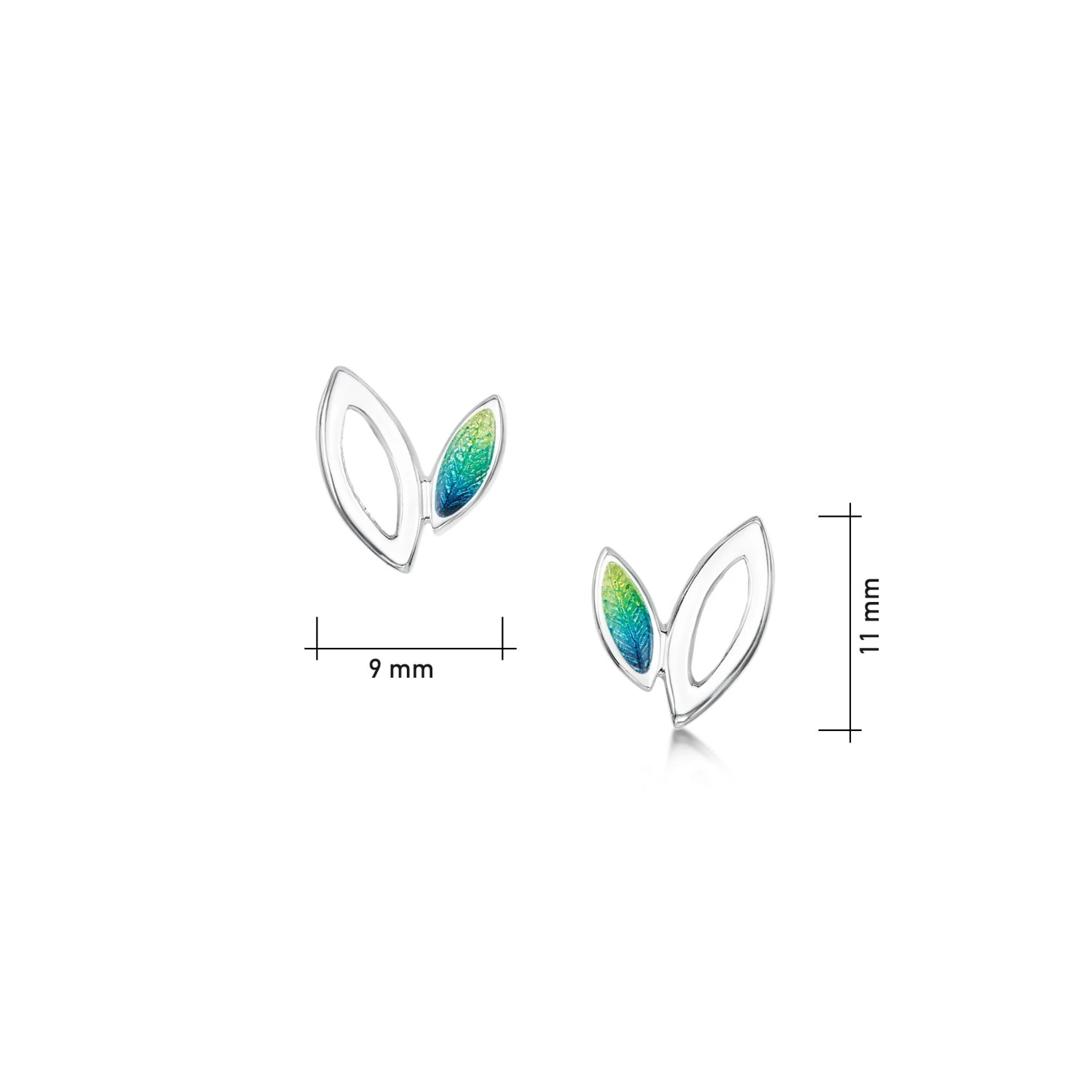 These petite sterling silver Seasons stud earrings feature two silver leaf shapes, one of which is highlighted in ‘Spring’ enamel. Each earring measures approximately 10mm x 12mm.