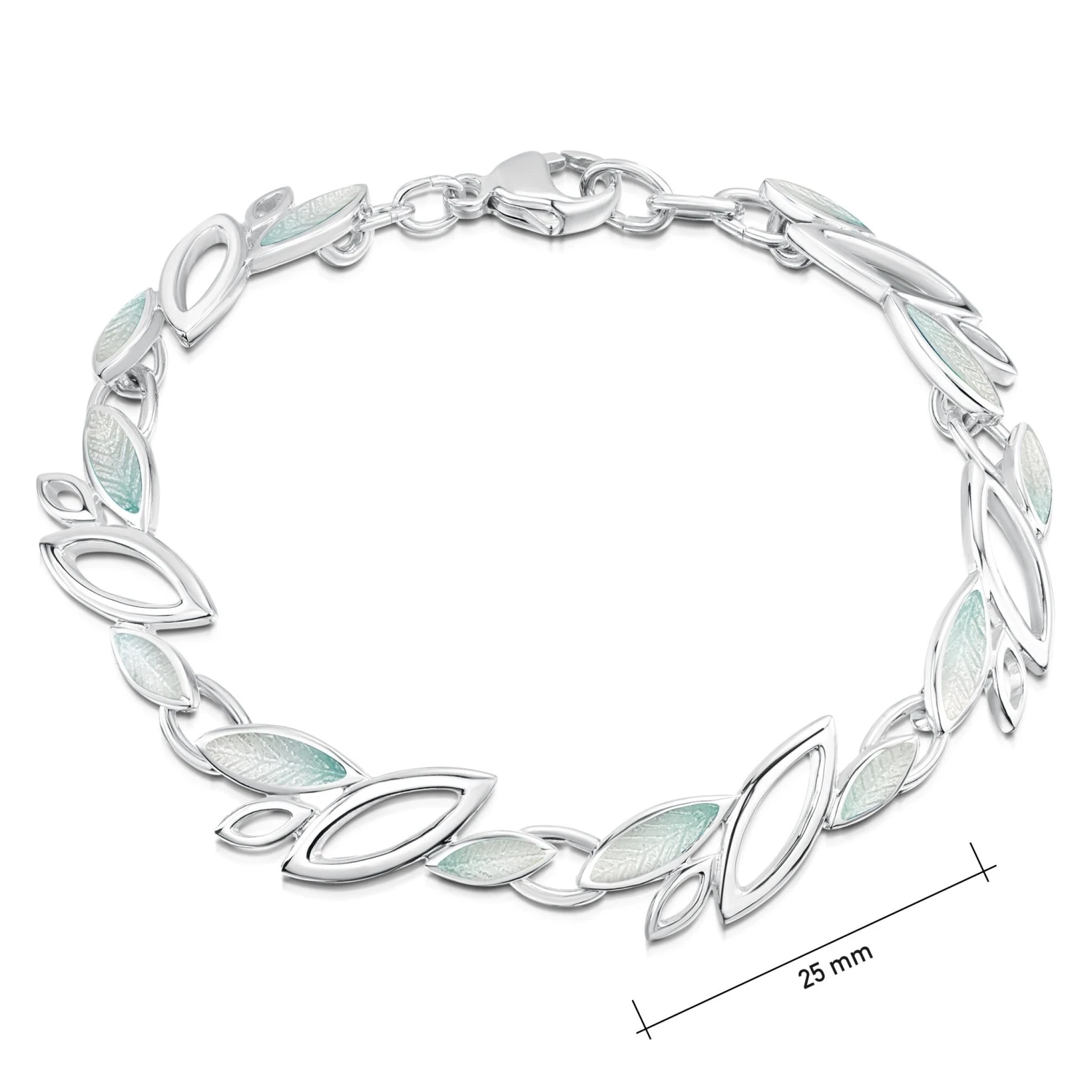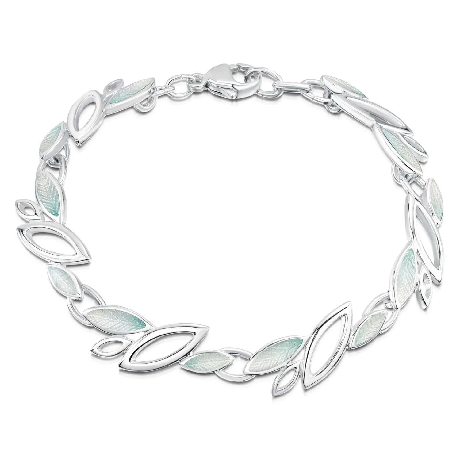 This sterling silver Seasons bracelet features multiple silver leaf-shape outlines, some enhanced with ‘Winter’ enamel, others left open.