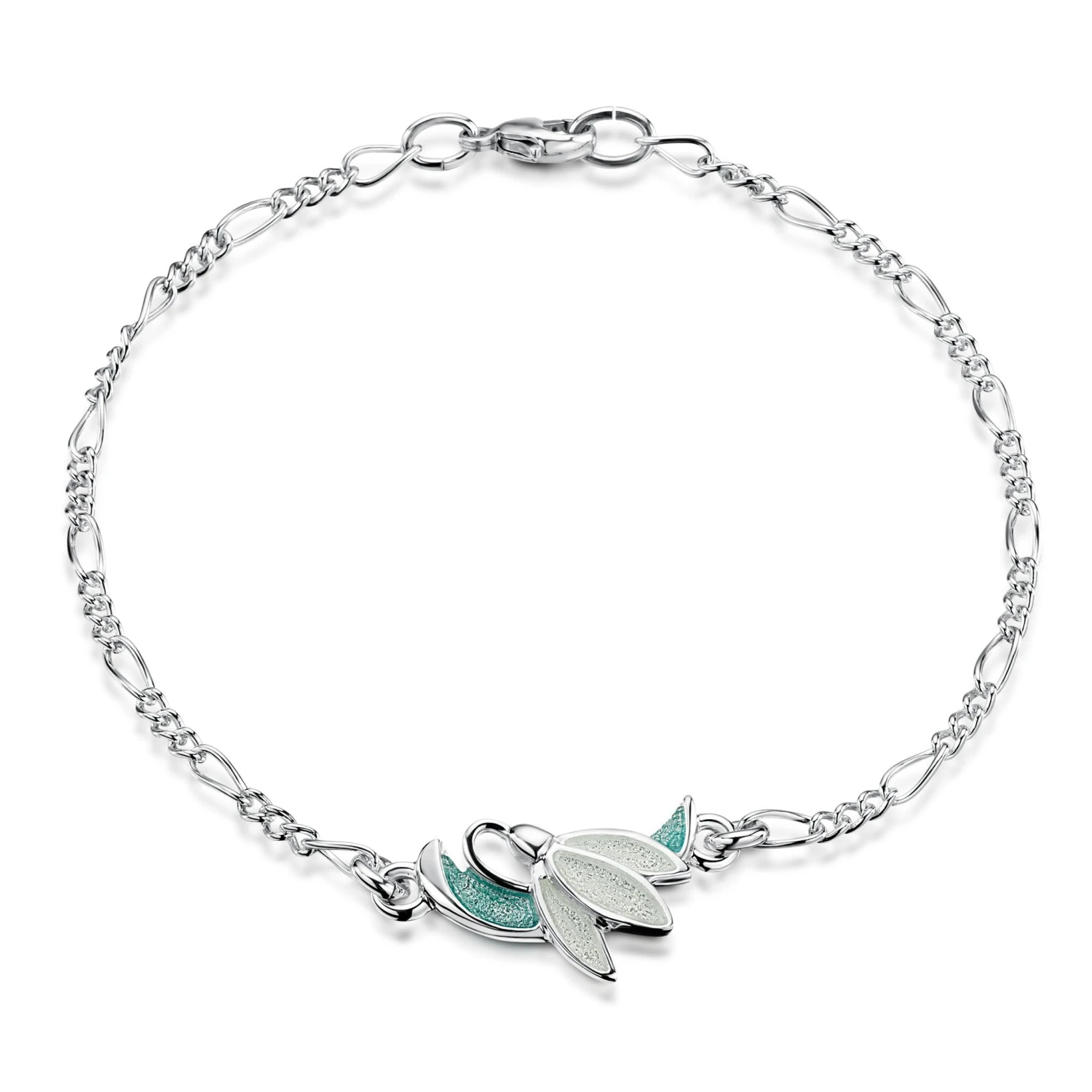 This Snowdrop Bracelet features a single enamelled snowdrop on a delicate silver chain. The snowdrop and leaf design is hand-enamelled in ‘Leaf’ enamel in our Orkney workshop and measures approximately 23mm wide.