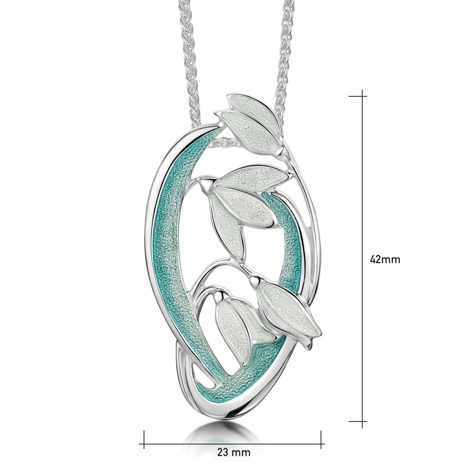 This Snowdrop pendant features four delicate snowdrops framed by curving leaves and stems. The sterling silver piece is hand-enamelled in ‘Leaf’ enamel in our Orkney workshop and hangs elegantly from a silver wheat chain.