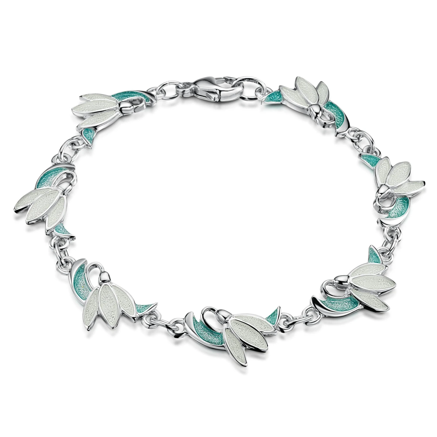 This Snowdrop Bracelet features seven linked flowering snowdrops, each one enamelled by hand in ‘Leaf’ enamel in our Orkney workshop.