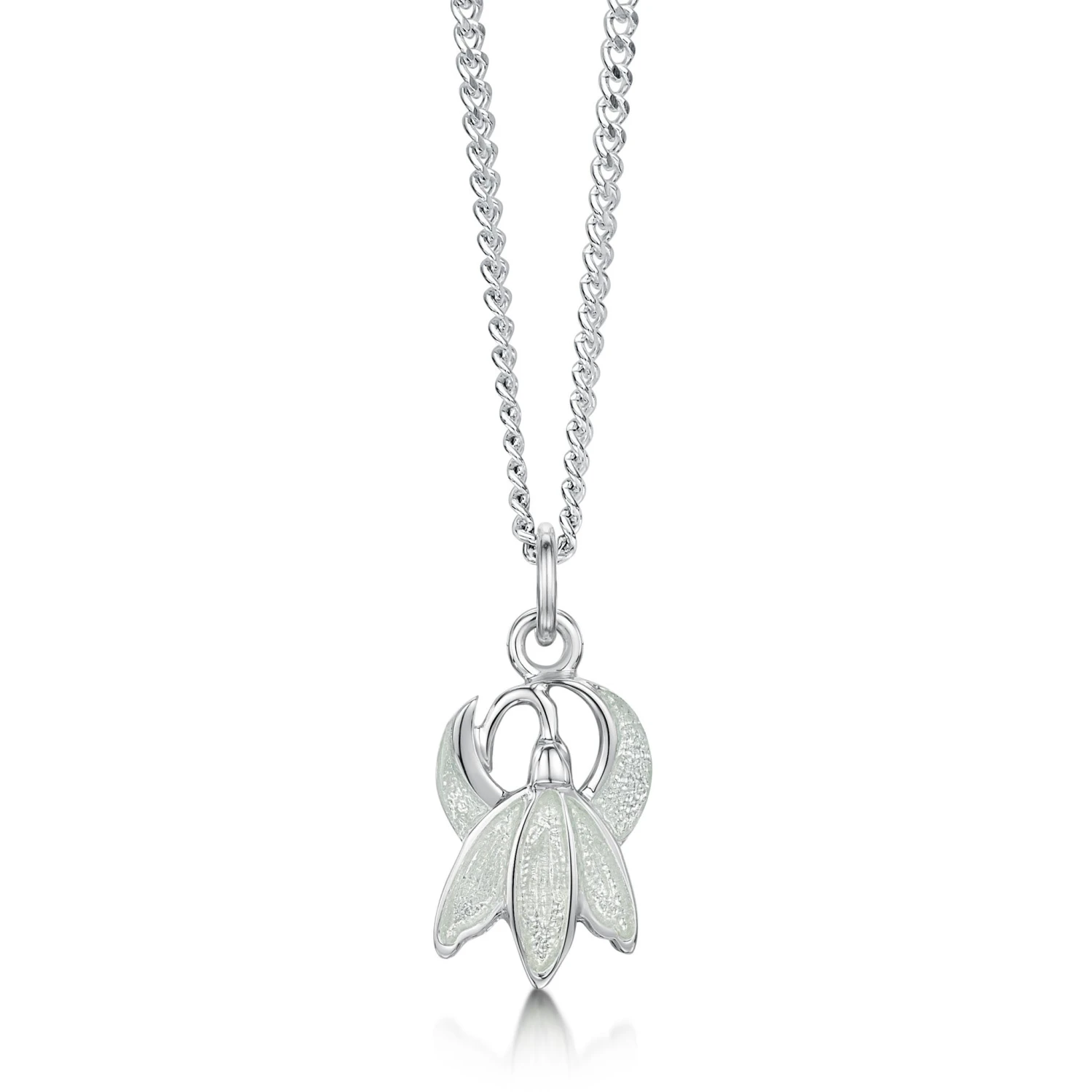 This petite Snowdrop Pendant in sterling silver features a single snowdrop set against the flower’s curving leaf and stem. The design is hand-enamelled in ‘Crystal’ enamel in our Orkney Workshop and hangs elegantly from a sterling silver curb chain.