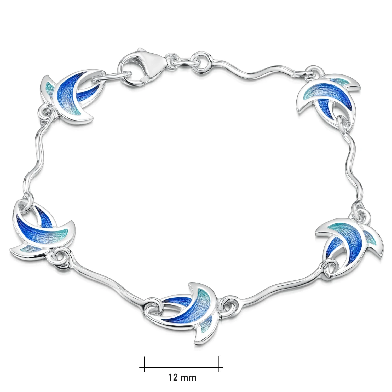 This small Summer Splash bracelet in sterling silver features five enamelled links, each separated from the next by a curved silver link. The design is hand-enamelled in our Orkney workshop in the colour ‘Summer Splash’.