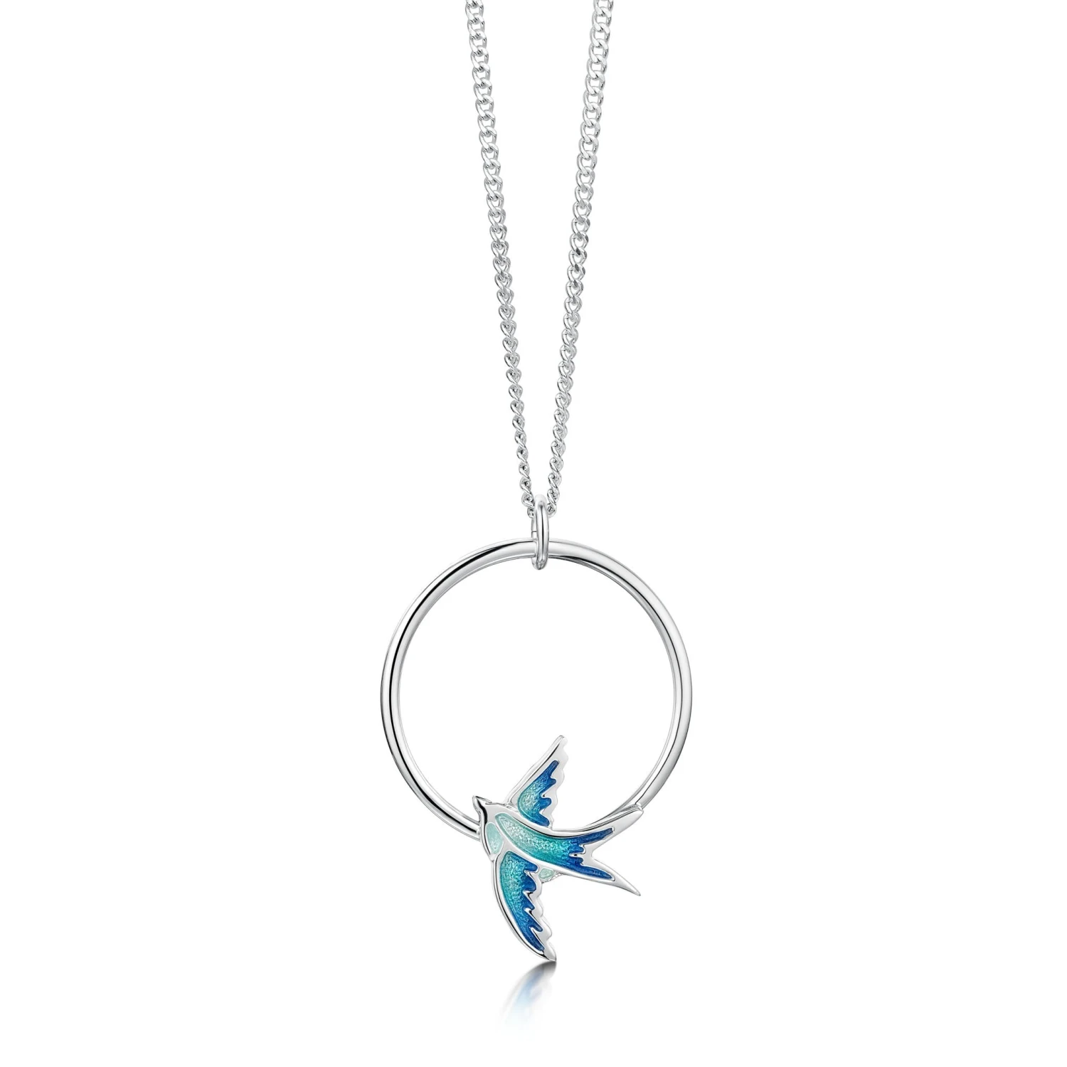 This sterling silver Swallows Pendant Necklace features an enamelled swallow in flight, adorning a small silver hoop. The design is hand-enamelled in ‘Summer Blue’ enamel and hangs elegantly on a silver curb chain.