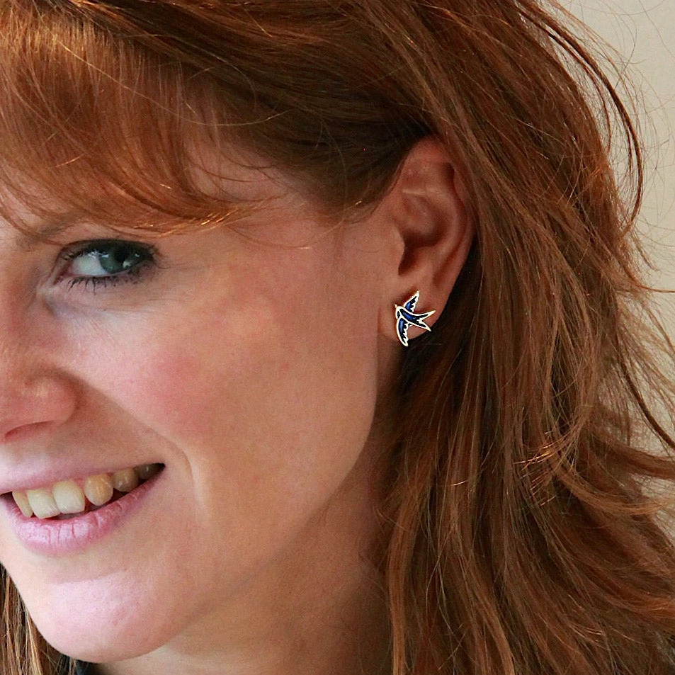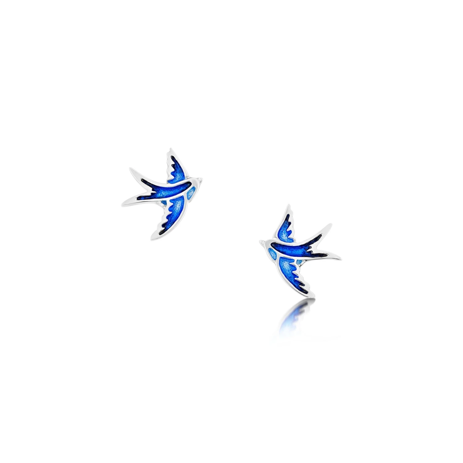 Each of these sterling silver Swallows Stud Earrings features an elegant swallow in flight, hand-enamelled in our Orkney workshop in Sapphire enamel. Each swallow is approximately 12mm by 15mm wide.