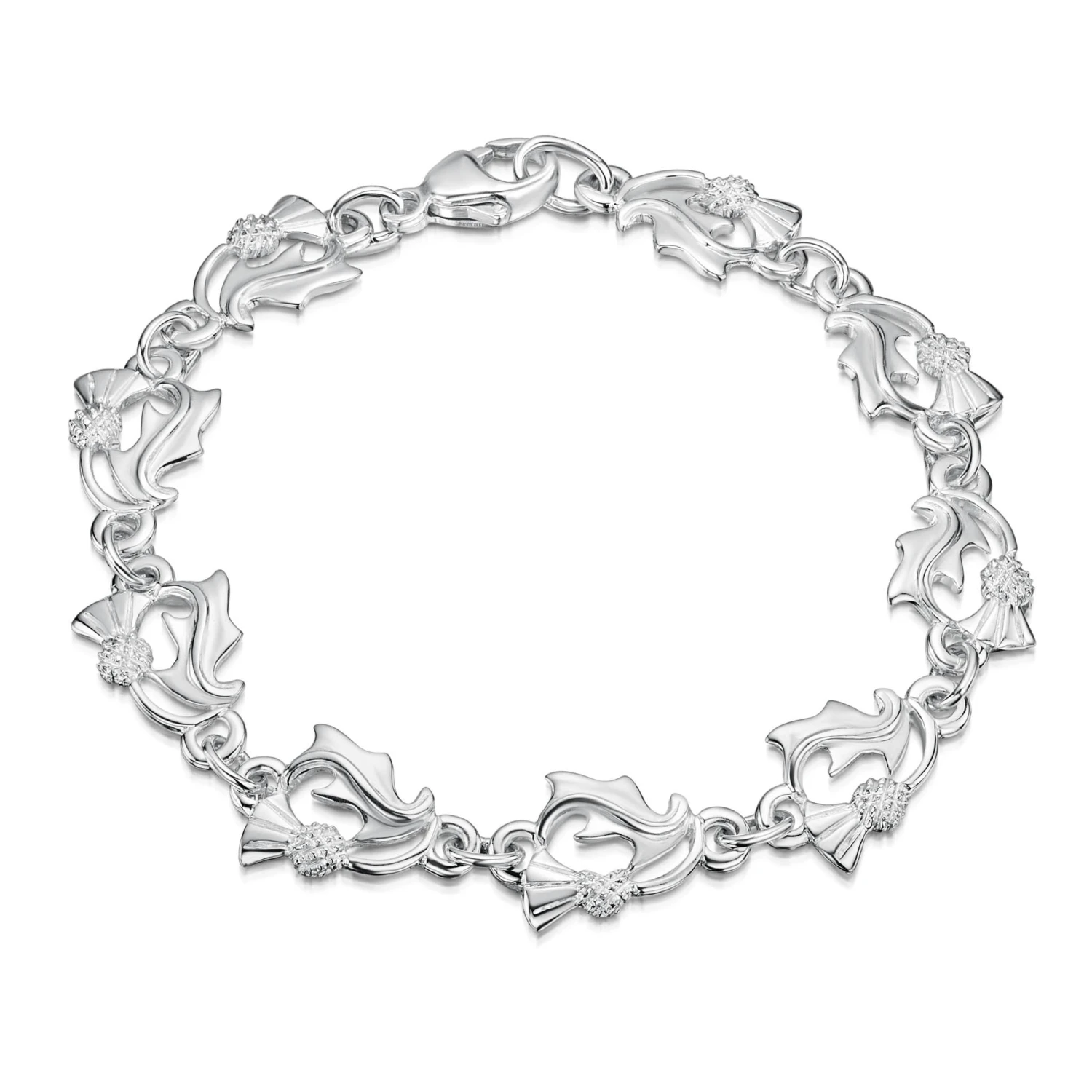 This Thistle bracelet in sterling silver features nine linked thistle designs. The bracelet is hand-finished in our Orkney workshop and each small thistle link measures approximately 12mm by 11mm.