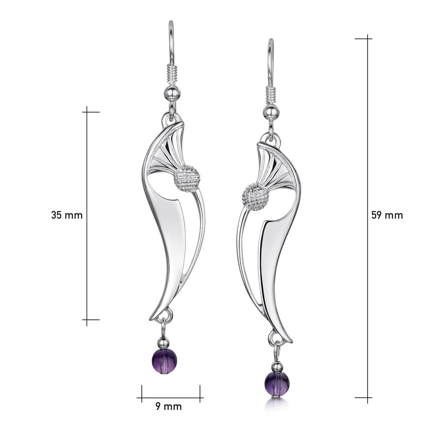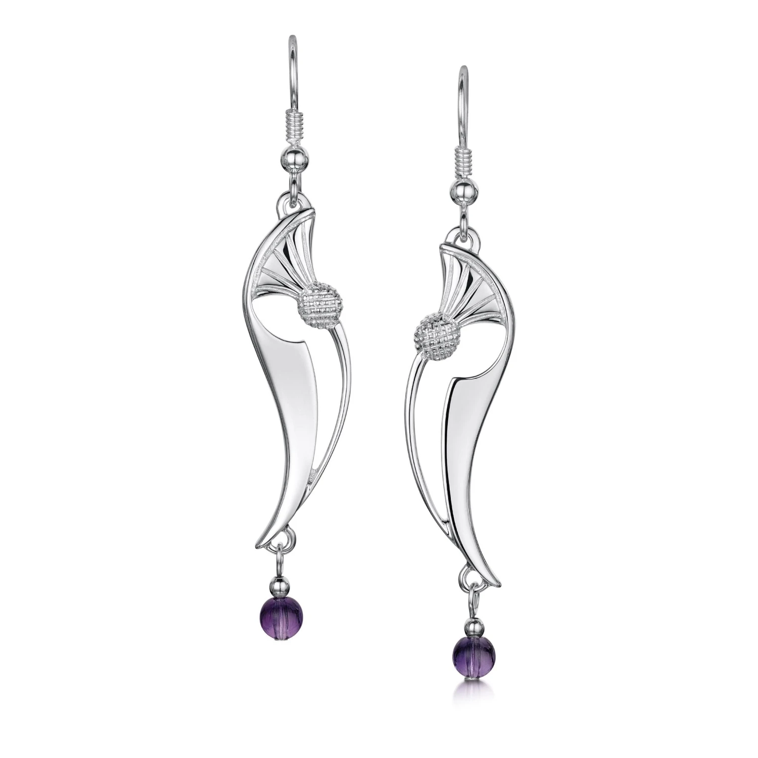 These Thistle drop earrings in sterling silver feature an elegant thistle design with a 4mm amethyst bead hanging from the bottom of the design. The earrings are hand-finished in our Orkney workshop and each have an overall drop length of approximately 59mm.