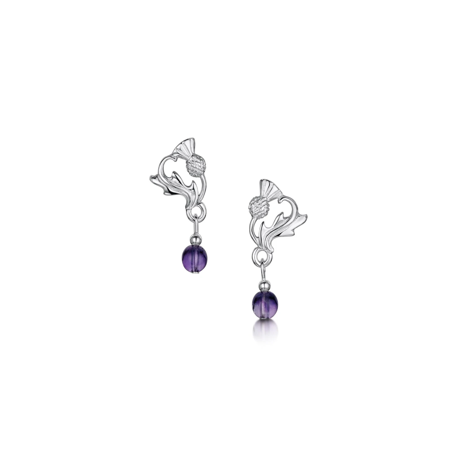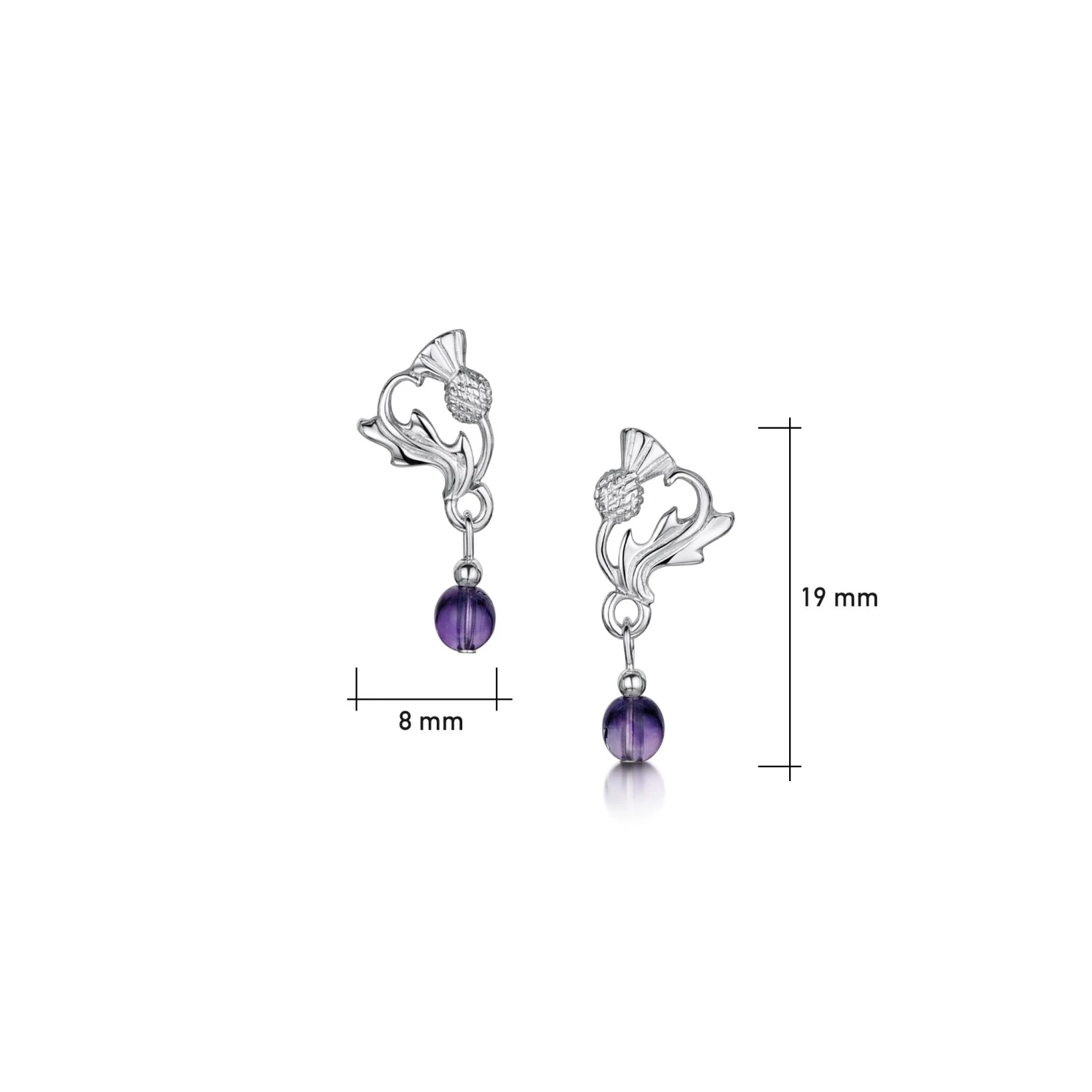 These small Thistle stud earrings in sterling silver feature a 4mm amethyst bead hanging from the bottom of the design. The earrings are beautifully hand-finished in our Orkney workshop and each measure approximately 8mm by 19mm.