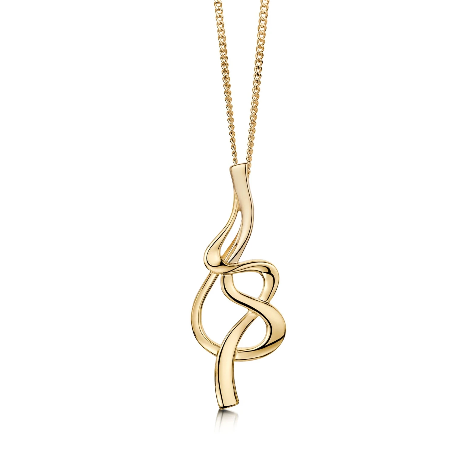 This Tidal pendant necklace in classic 9ct yellow gold features a delicate interlacing design, hand-finished in our Orkney workshop and elegantly drops from a gold curb chain. The pendant design measures approximately 16mm by 45mm long.