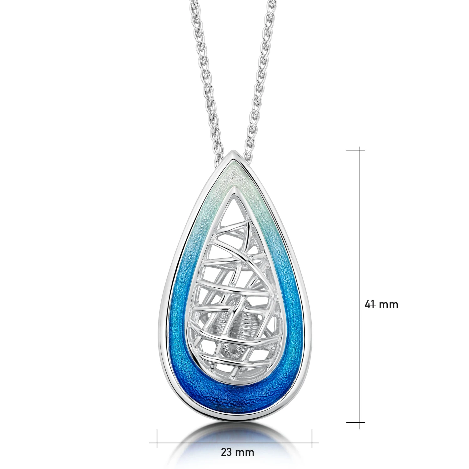 This sterling silver Tidal Treasures Pendant Necklace is available in a variety of enamel colours and hangs elegantly on a silver wheat chain. The ‘Pentland’ enamel surrounding this piece represents the sea, while the lattice-like design represents a fisherman’s creel. A solid silver Groatie Buckie is held inside the pendant’s ‘creel’ design and is free to move within.
