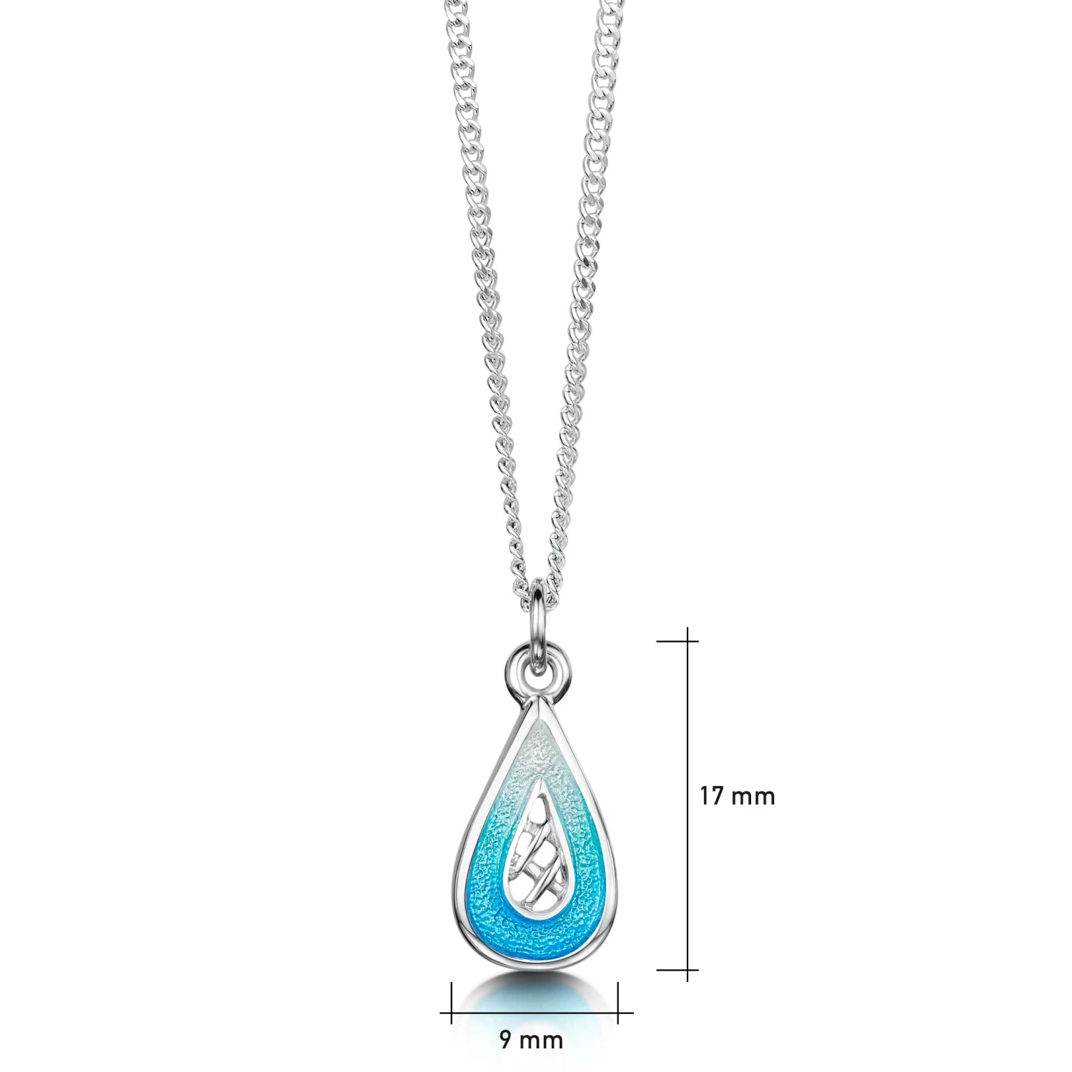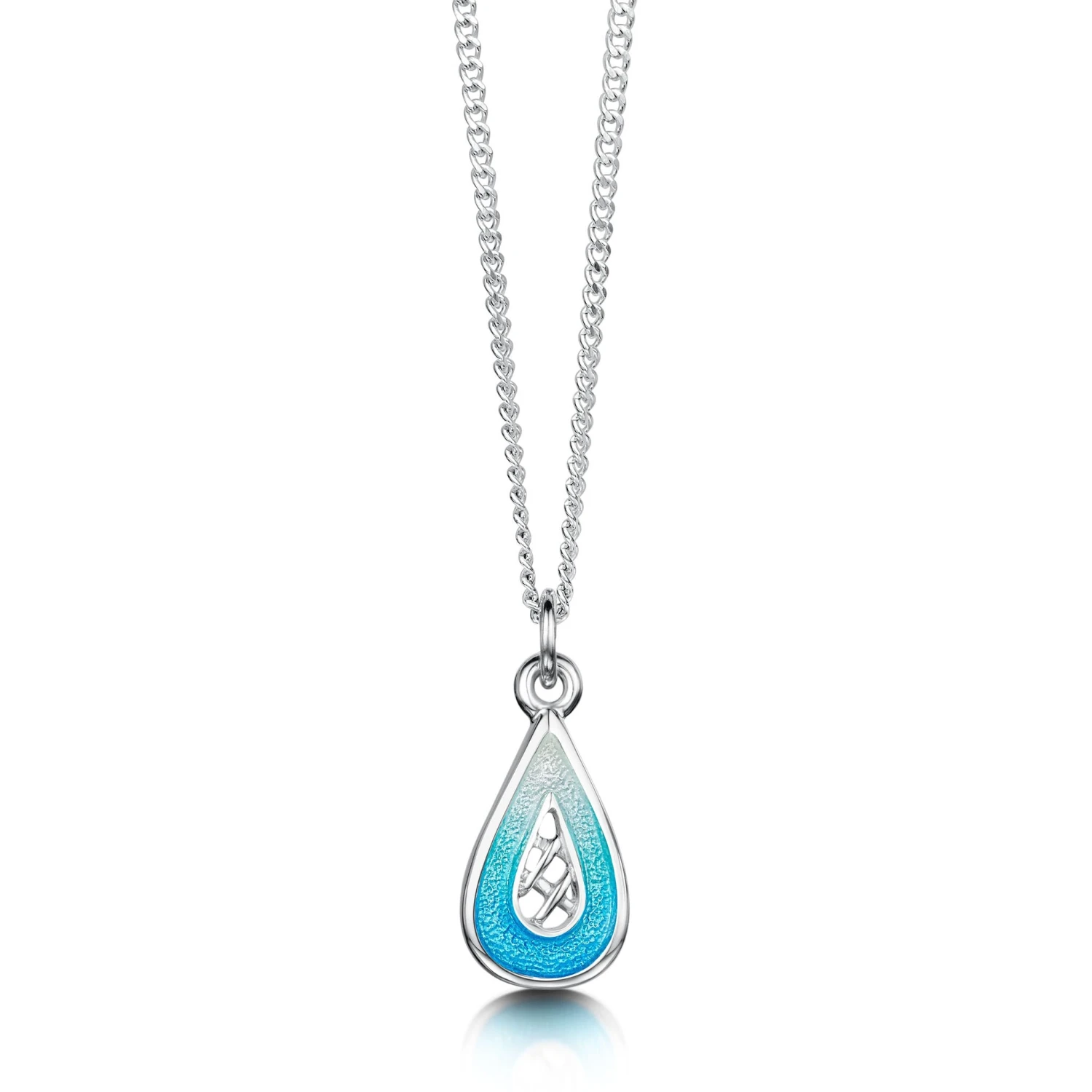 This petite, sterling silver Tidal Treasures Pendant Necklace is available in a variety of enamel colours and hangs elegantly on a silver wheat chain. The ‘Shallows’ enamel surrounding the piece represents the sea, while the lattice-like design represents a fisherman’s creel.
