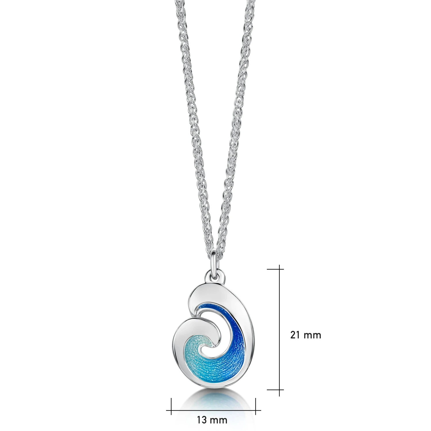 This Wave pendant in sterling silver beautifully captures the majesty of the seas around Orkney. The design is hand-enamelled in our Orkney workshop in Light Ocean enamel and measures approximately 13mm by 21mm.
